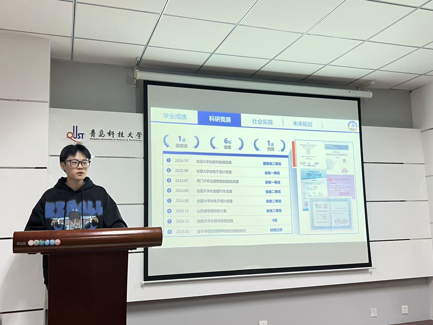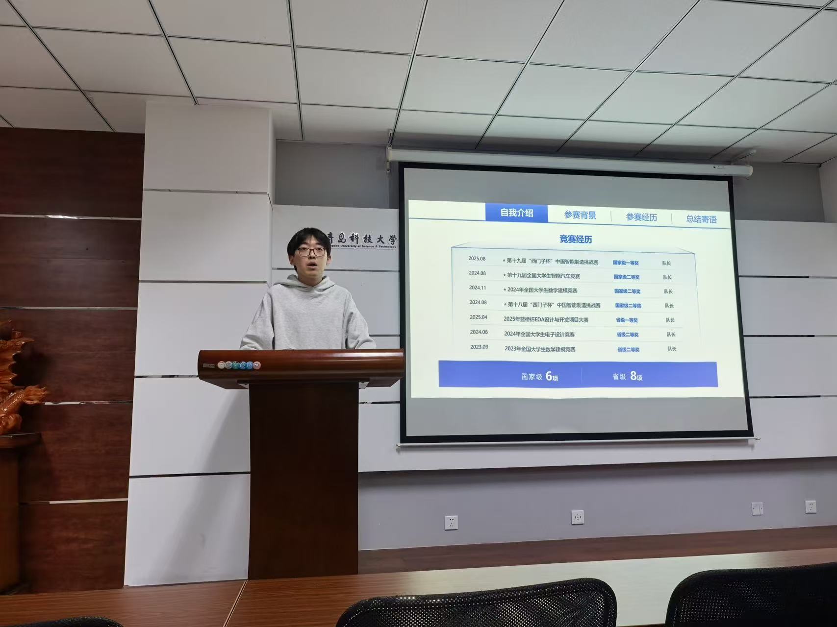 分享会上,电气222班的李海鸣同学以参与“西门子杯” 中国智能制造挑战赛、全国大学生智能汽车竞赛等赛事为例,从参赛动机、赛事选择、团队协作、资源利用等多个维度,系统分享了备赛经验。他特别指出“勇于尝试是成功的第一步”,并鼓励同学们在竞赛中锤炼工程思维与现场问题解决能力。