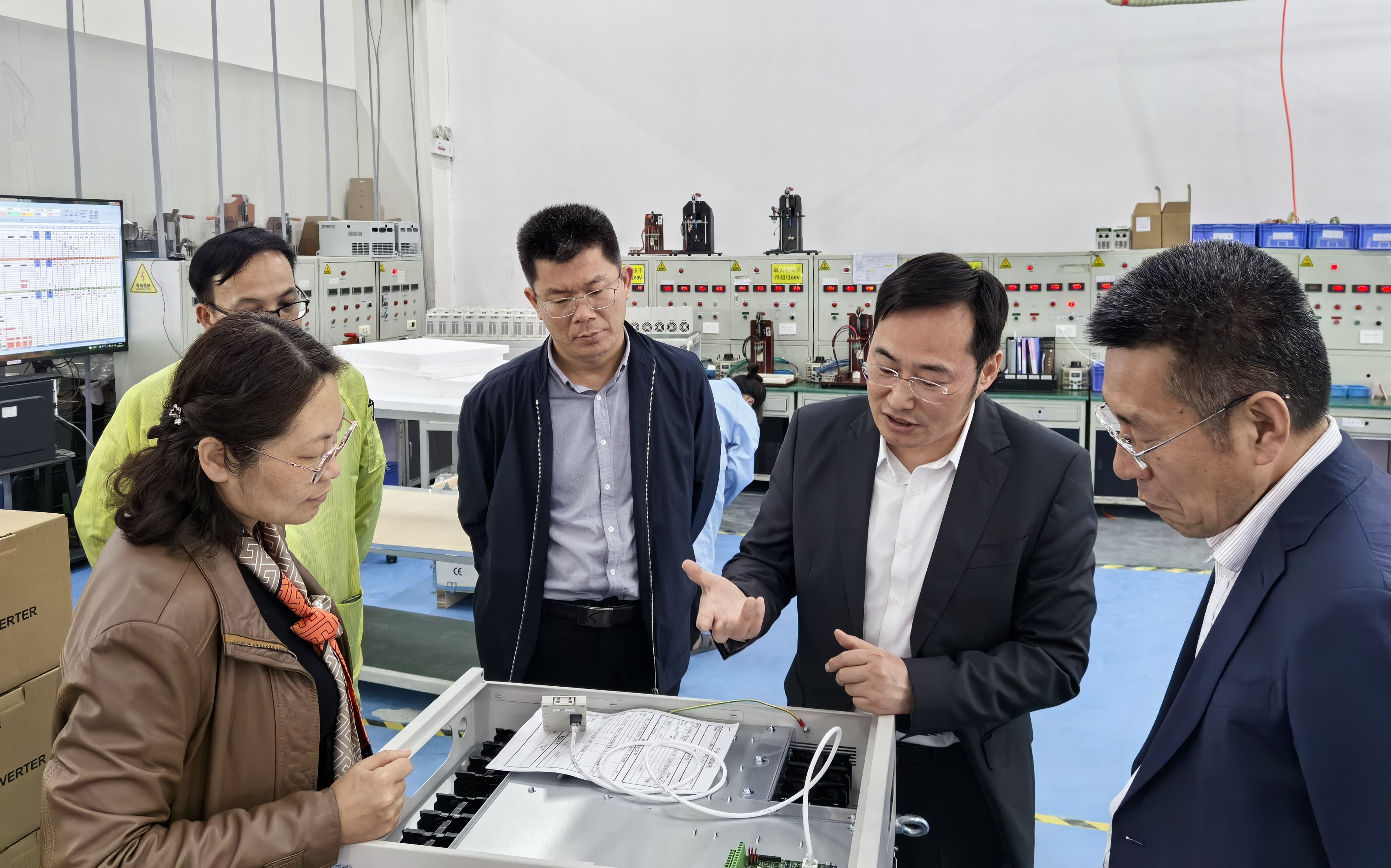 李卉一行参观了杰特公司生产车间。参观过程中,宋明忻详细介绍了公司在通用产品基础上,根据行业、客户实际需要,量身制定各种变频器、专用电机、PLC可编程控制器生产情况,公司产品广泛应用于冶金、石油、化工、机床、建材、市政工程、纺织、印刷、矿山等领域。李卉一行详细了解了各种仪器的型号、生产过程。