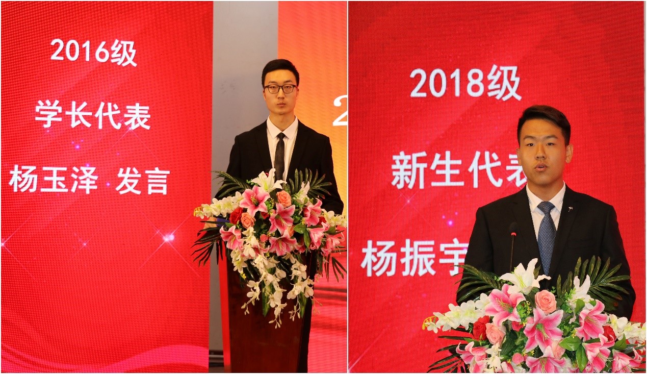 在校生代表、国家奖学金获得者杨玉泽发言,他分享了自己的学习经验。新生代表杨振宇发言,表达了对大学生活的美好期望。