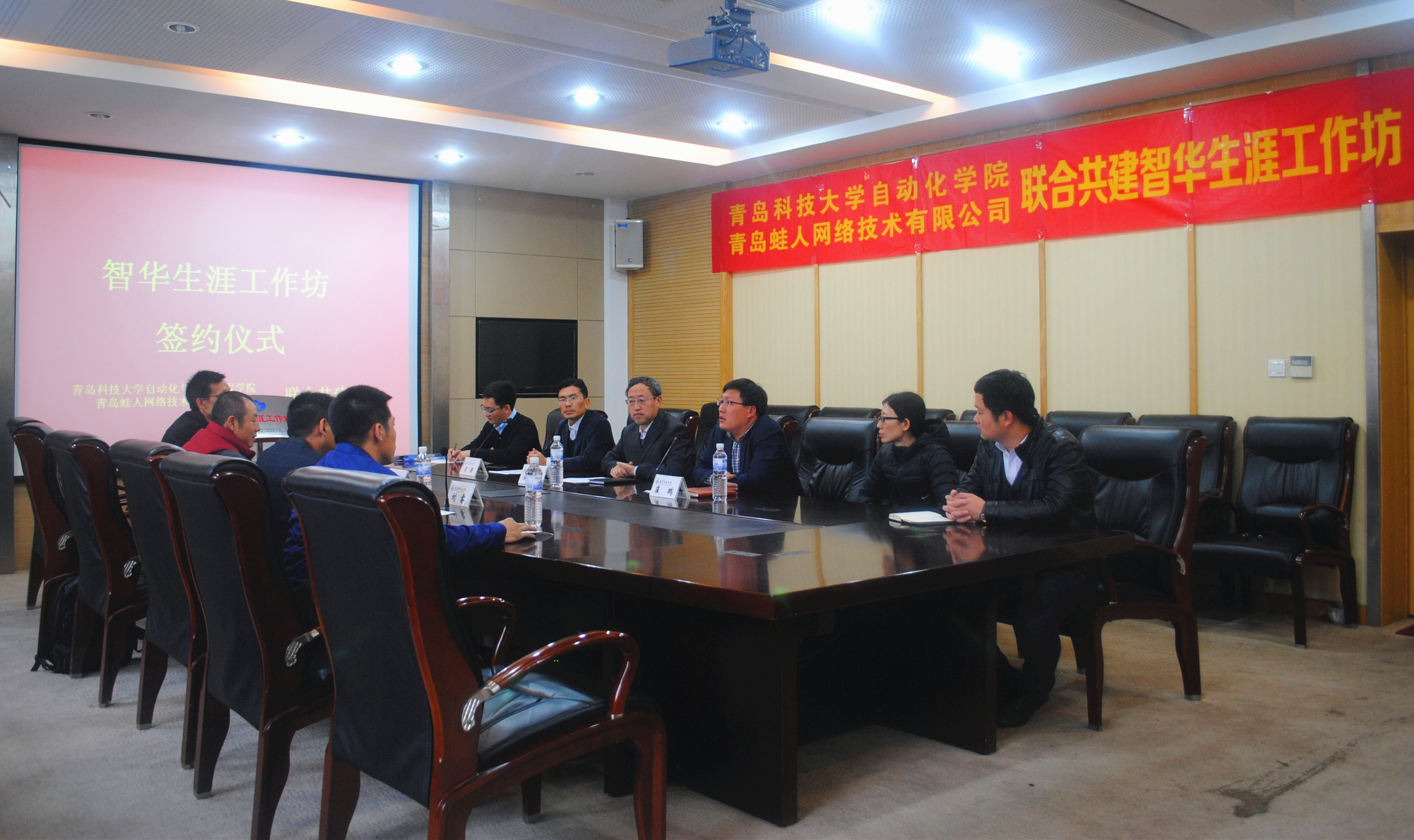 与青岛蛙人网络技术有限公司共建的山东省首家校企合作大学生职业生涯工作坊——“智华生涯工作坊”揭牌仪式在四方校区第一会议室举行。swag直播