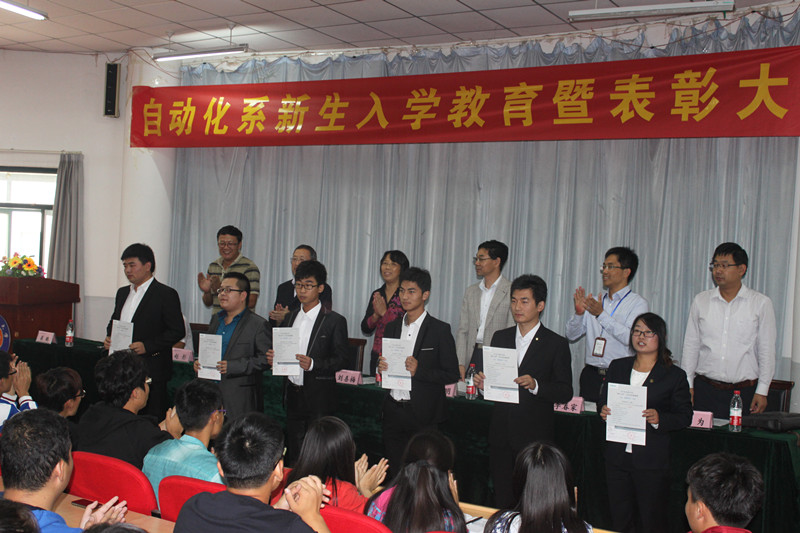 发展历史、专业设置、人才培养等情况进行了详细介绍,并鼓励同学们借助校区实验室建设发展平台,积极参与学科竞赛。刘同刚首先对新生表示欢迎,并提出三点希望:一是要有理想、树立目标;二是明确自身优势,取长补短;三是保持艰苦奋斗,开拓创新。陈为希望同学们要独立自强、刻苦学习,积极参加各项活动,平时多与父母老师沟通交流,对自己的大学生活做出合理的规划。李春家宣读了《关于表彰2014年西门子杯”工业自动化挑战赛与电子设计竞赛获奖同学的决定》的文件,对取得优秀成绩的牛延绮、李金钊、姜仁卓等40名同学进行了表彰,并颁发了获奖证书。