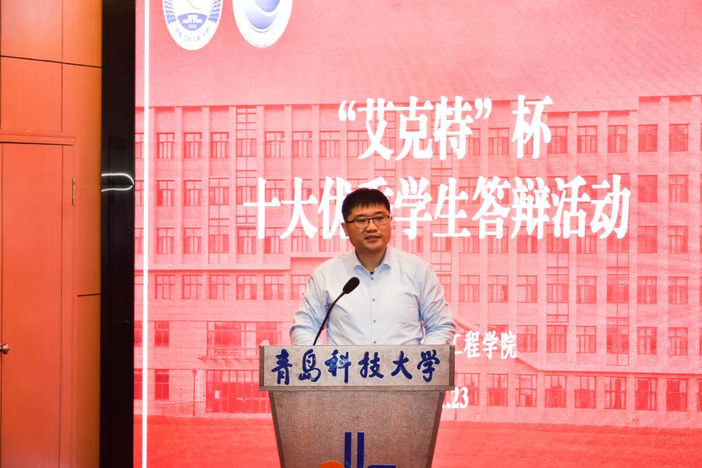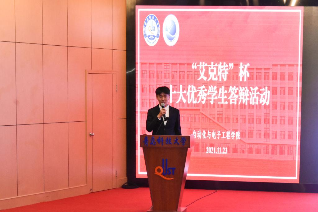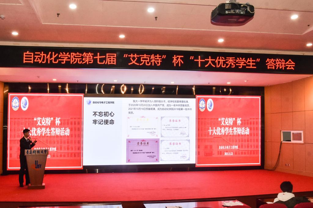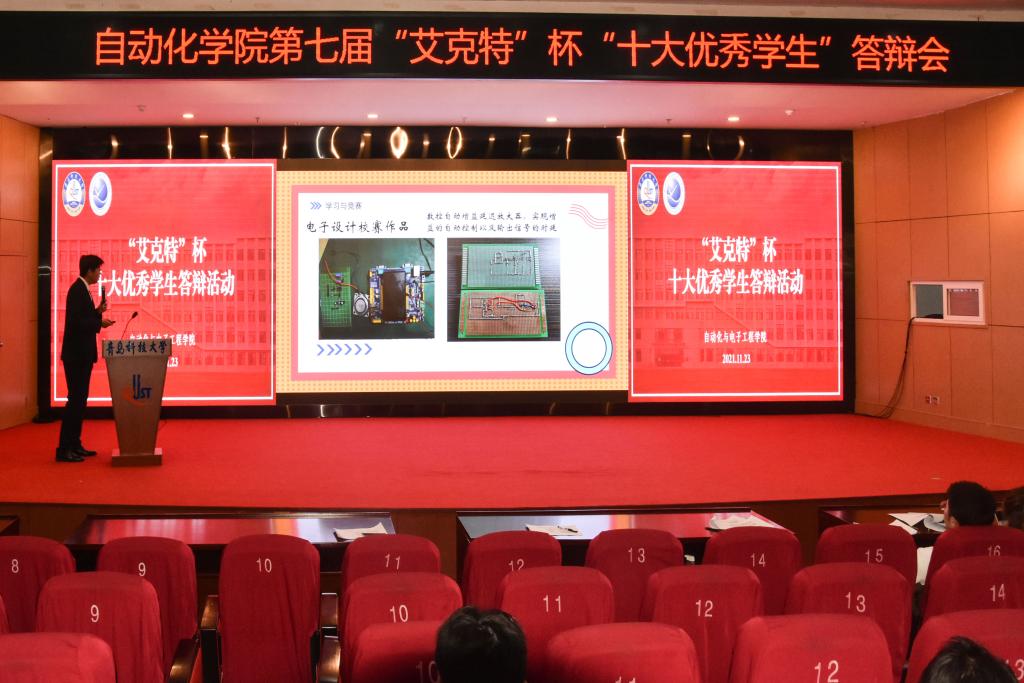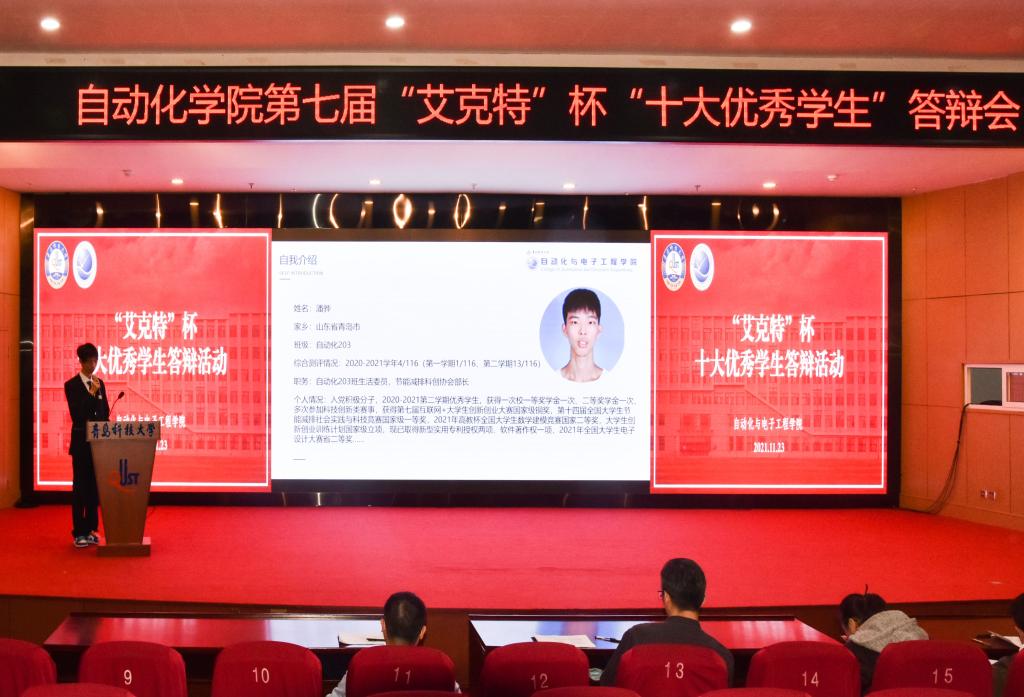 于11月23日下午在崂山校区英科报告厅举行第七届“艾克特”杯“十大优秀学生”答辩会。学院副院长、院校友会副会长曹梦龙,学院党委副书记兼副院长、院校友会秘书长马寒,团委书记兼学工办主任郭蒙蒙,团委副书记兼学工办副主任于彬、郝雄文,全体团委老师以及各年级学生代表参加活动。此次答辩会通过自化易班工作站抖音账号线上同步直播。