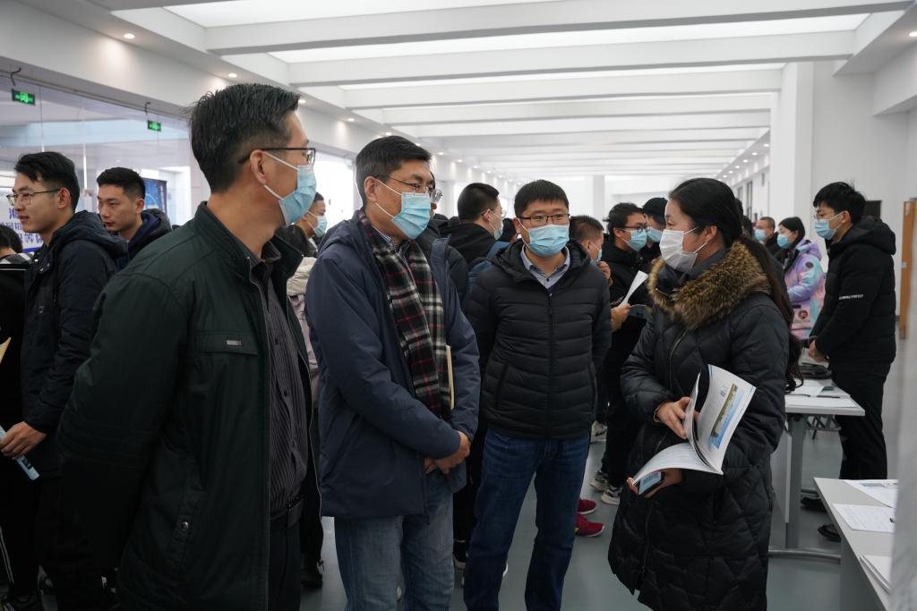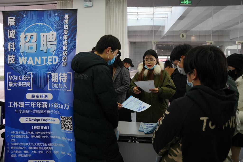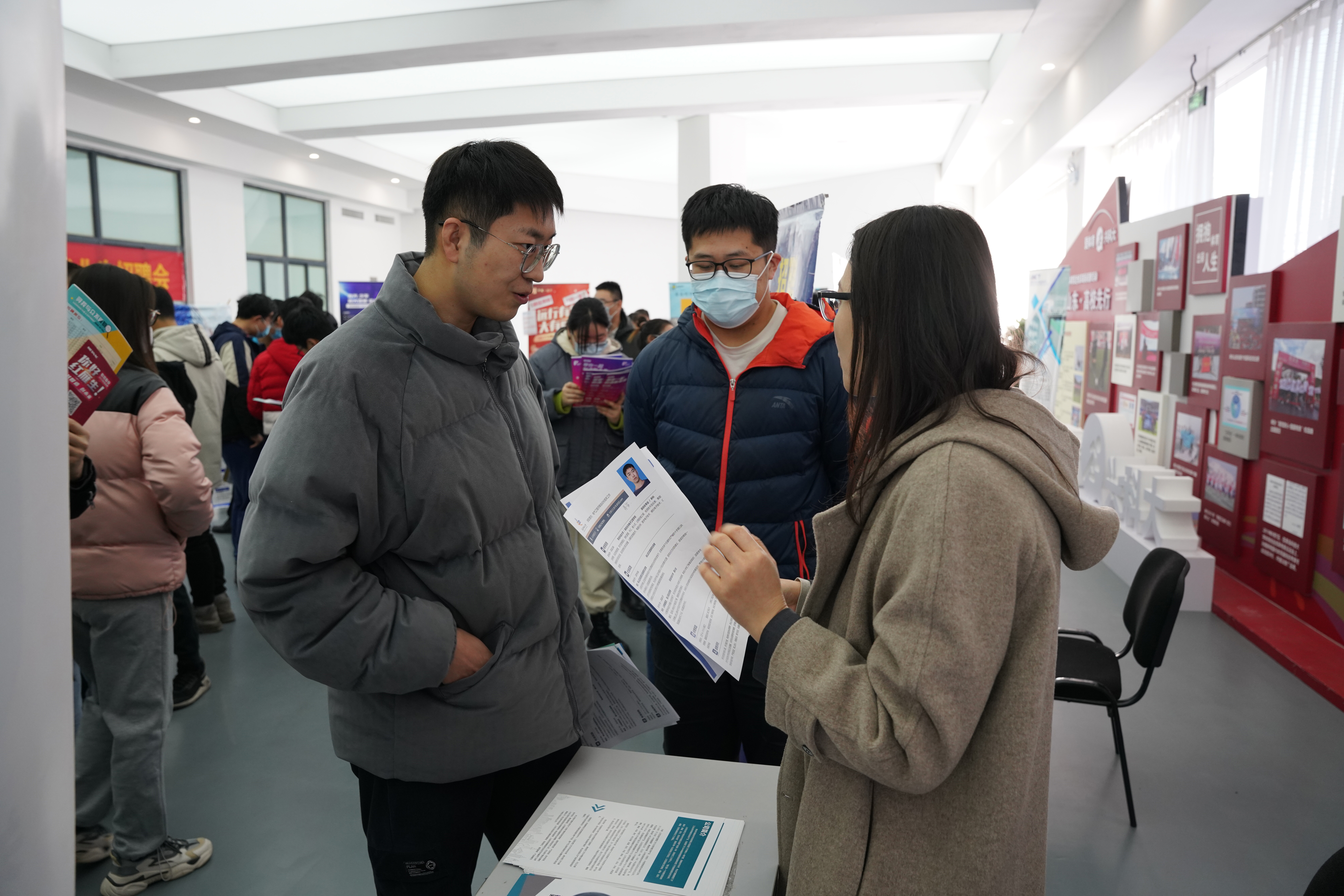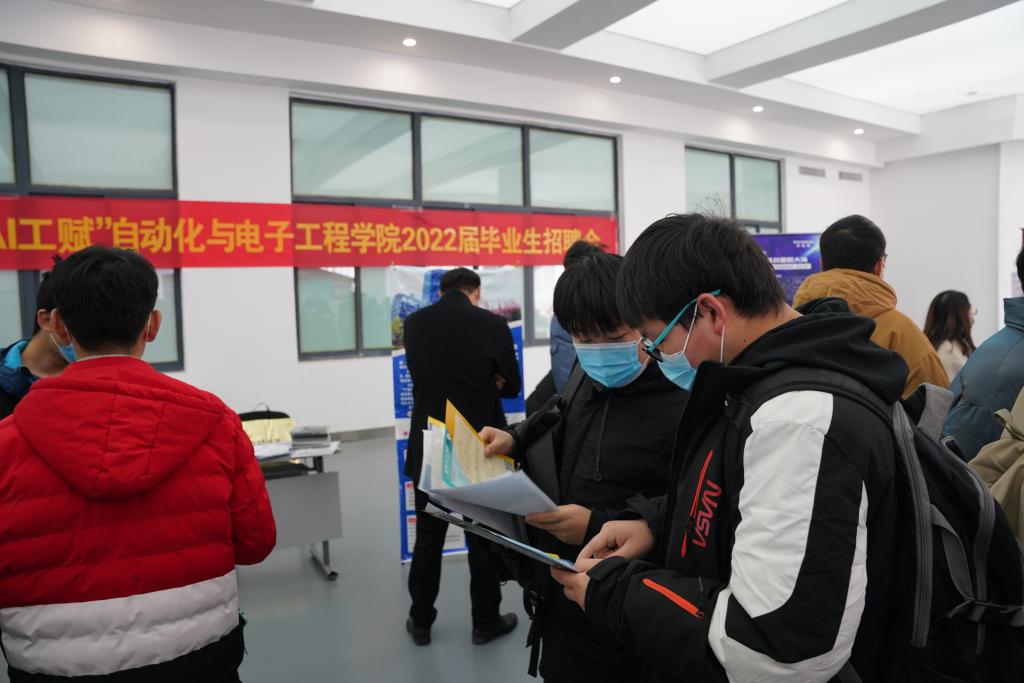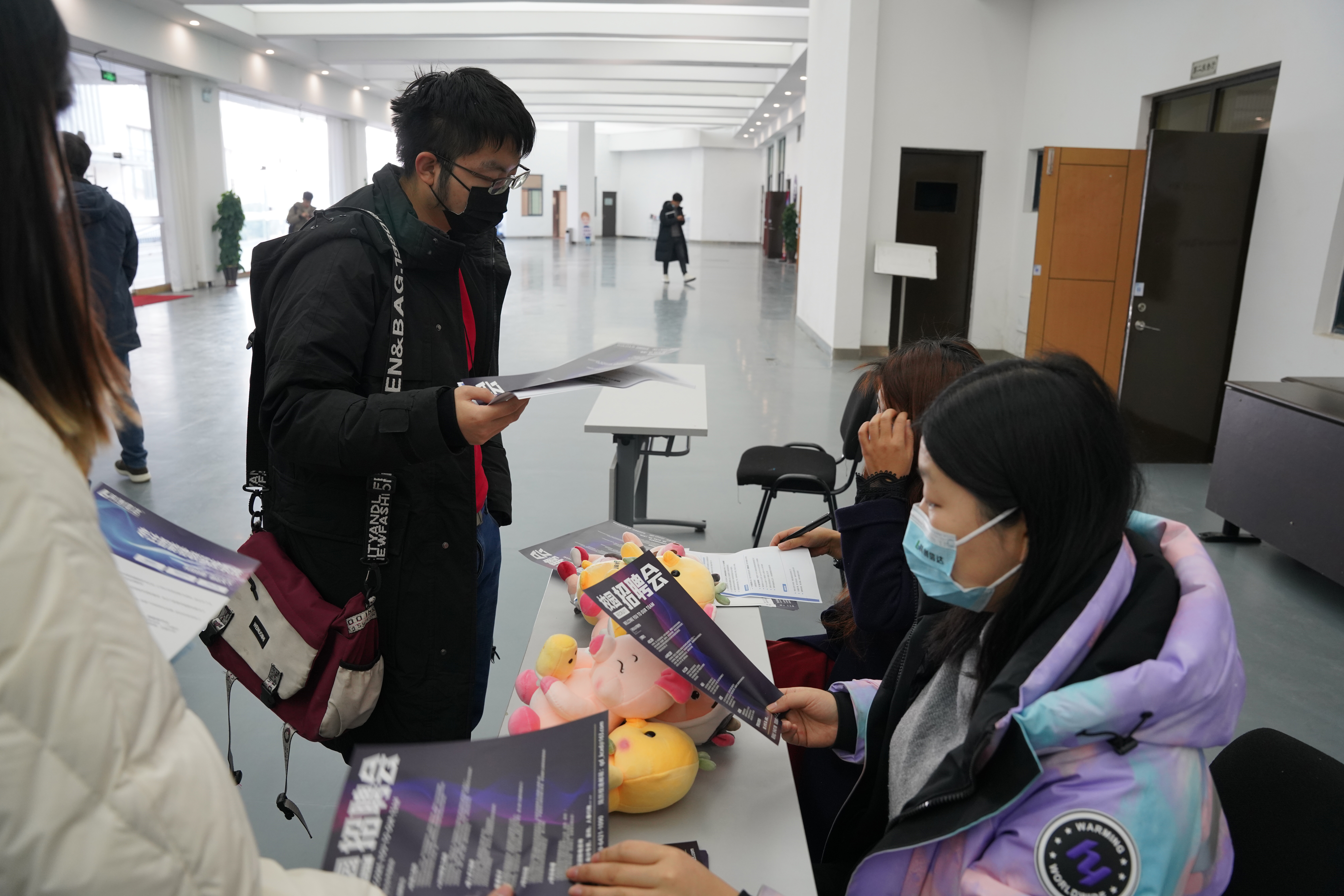 随后,学院“AI工赋”首场招聘会在报告厅门口火热展开。此次招聘会在疫情防控要求下,共组织16家优质用人单位参与,涵盖专业相关的多个就业岗位。前来招聘的单位都精心准备了印有企业logo的小礼品、笔记本、手办,到场同学提前对应聘岗位进行了解,精心准备简历,现场主动把握机会,积极投递。