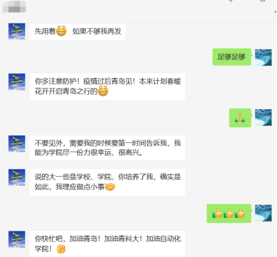 03级校友马涛在得知青岛疫情防控升级后,主动与母校联系,了解母校防疫物资需求,提出要为母校坚守在抗疫一线的师生捐赠一批抗疫物资。