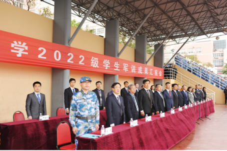 全体起立,升国旗,奏唱国歌。在庄严的国歌声中,2022级学生军训成果汇报大会正式开始。