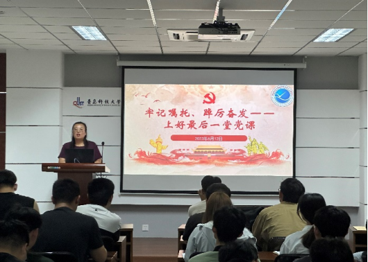6月12日,2023届毕业生党员于学院楼410会议室开展“最后一堂党课”,学生第一党支部书记郭蒙蒙老师结合学生们大学四年学习生活的经历,对即将踏上新的学习和工作岗位的同学们提出了殷切的期盼和嘱托,希望同学们能够勇于担当党员责任,时刻不忘党员身份,不断提高党性修养,以昂扬姿态踏上新征程,以奋进青春建功新时代,让青春在全面建设社会主义现代化国家的火热实践中绽放绚丽之花。
