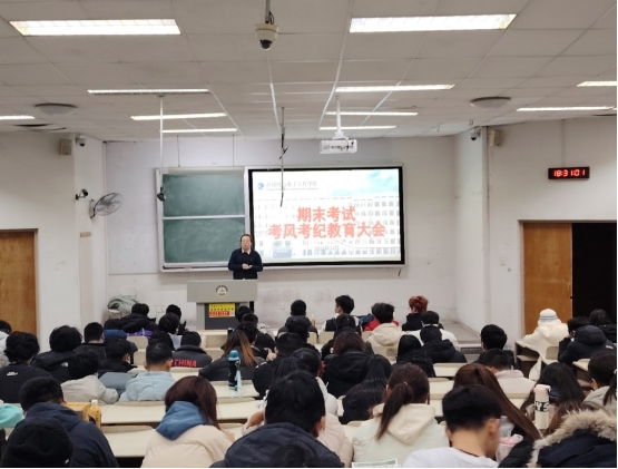 在弘毅楼举办期末考试考风考纪教育大会暨离校安全教育大会。学院团委书记兼学工办主任、2023级新生辅导员郭蒙蒙主持,新生辅导员刘志飞及全体大一学生参加会议。