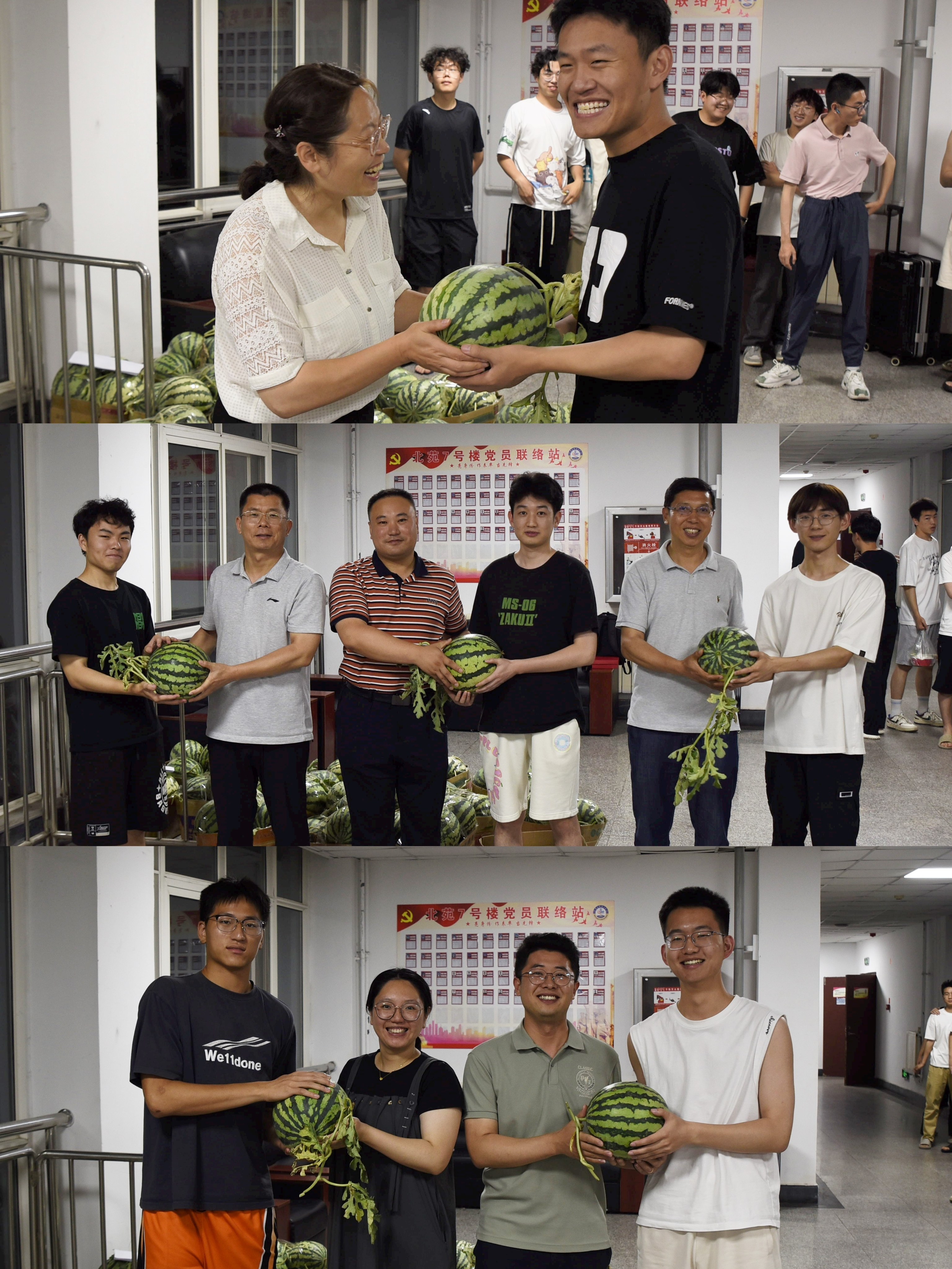 党政领导一行深入学生宿舍,为临行的毕业生送去夏日解暑的西瓜作为临别关怀。学院党委书记李卉、党委副书记兼副院长刘名森,副院长张伟、生宁、张典及辅导员走进毕业生宿舍,与毕业生亲切交流,送上这份“顶呱呱”的暖心。