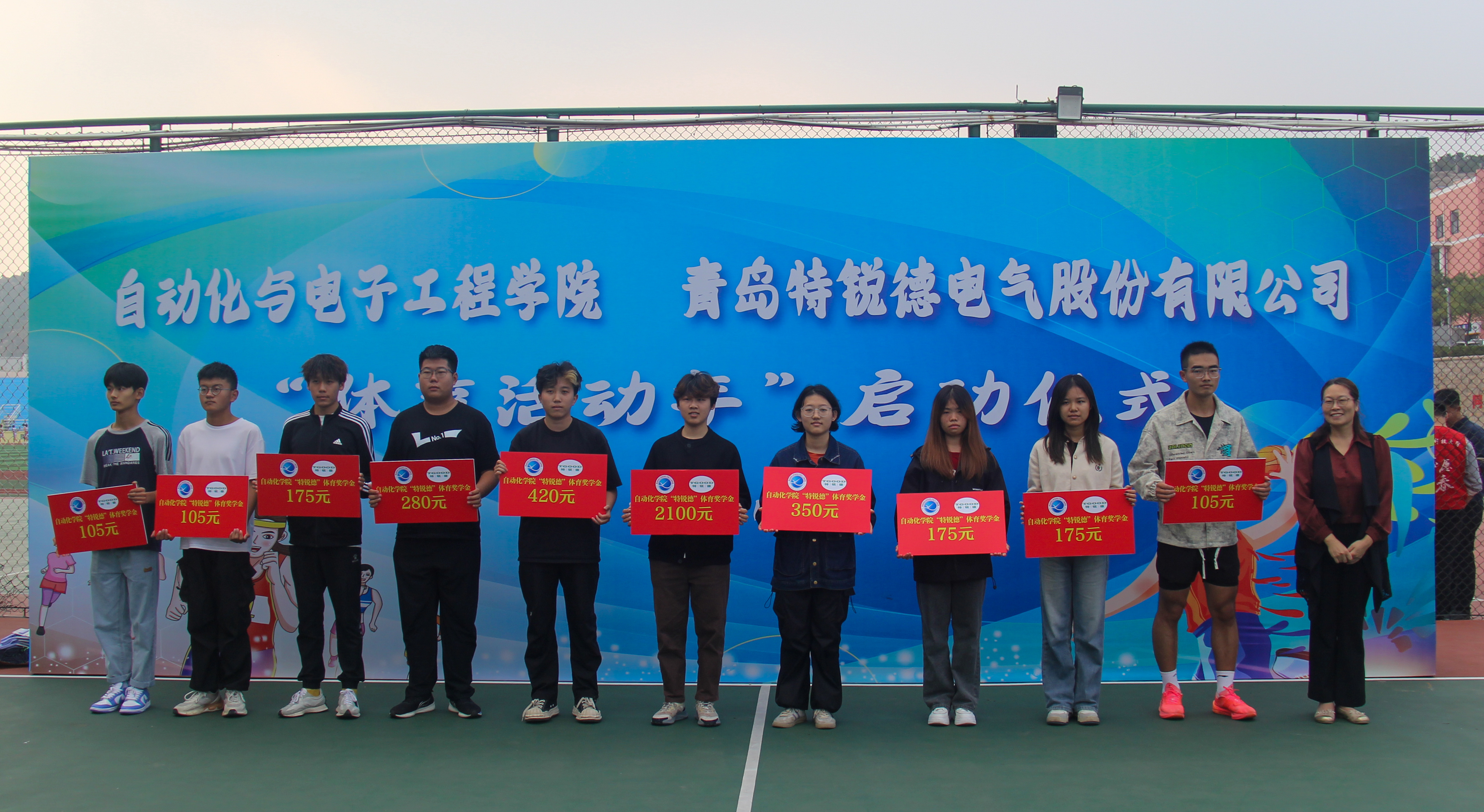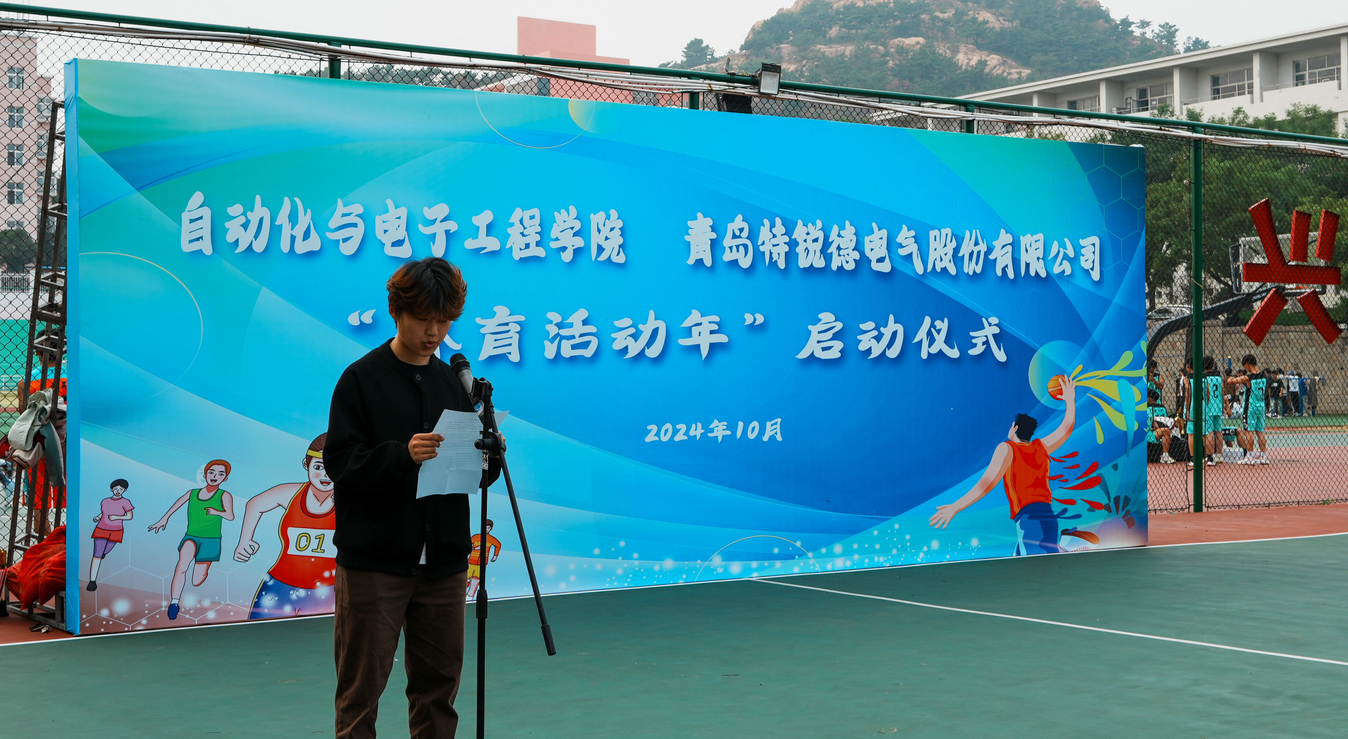 与青岛特锐德电气股份有限公司联合举办的“大学生体育活动年”启动仪式于南苑篮球场举行。青岛特锐德电气股份有限公司人力资源中心人力总经理助理张莹,学院党委书记李卉,学校教务处专职教学督导员楚晓东、学生处副处长李春家、团委副书记李浩,学院党委副书记兼副院长刘名森出席启动仪式。仪式由学院团委书记兼学工办主任雷静主持。