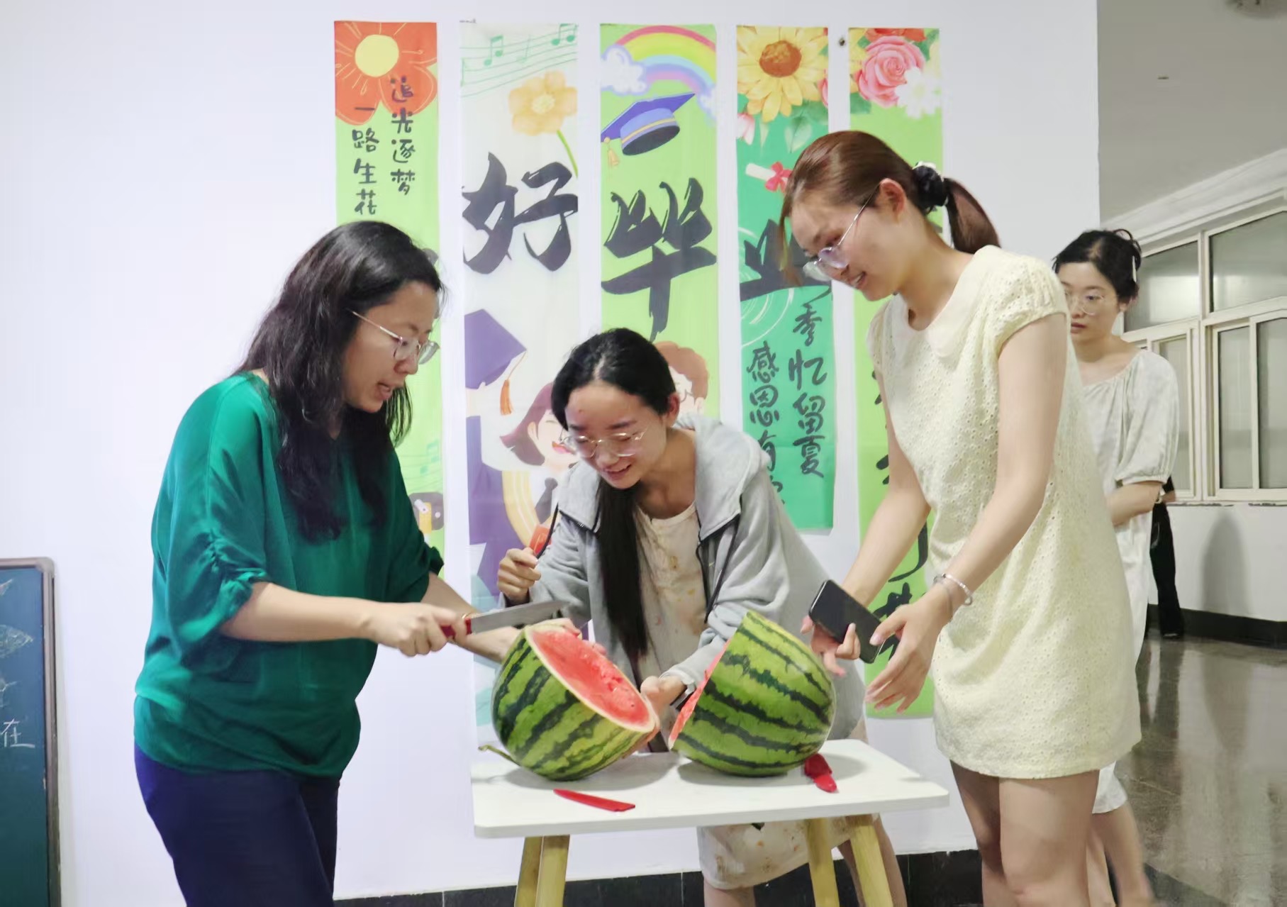 欢送会现场气氛热烈而温馨,学院精心筹备“瓜香送远行”特色环节。李卉、刘名森共同向毕业生代表馈赠解暑西瓜,寓意学子们未来生活“瓜熟蒂落、硕果累累”,事业发展“红红火火、甜美如饴”。现场师生共切“毕业瓜”,在欢声笑语中共话校园往事,畅叙理想抱负,定格珍贵记忆。