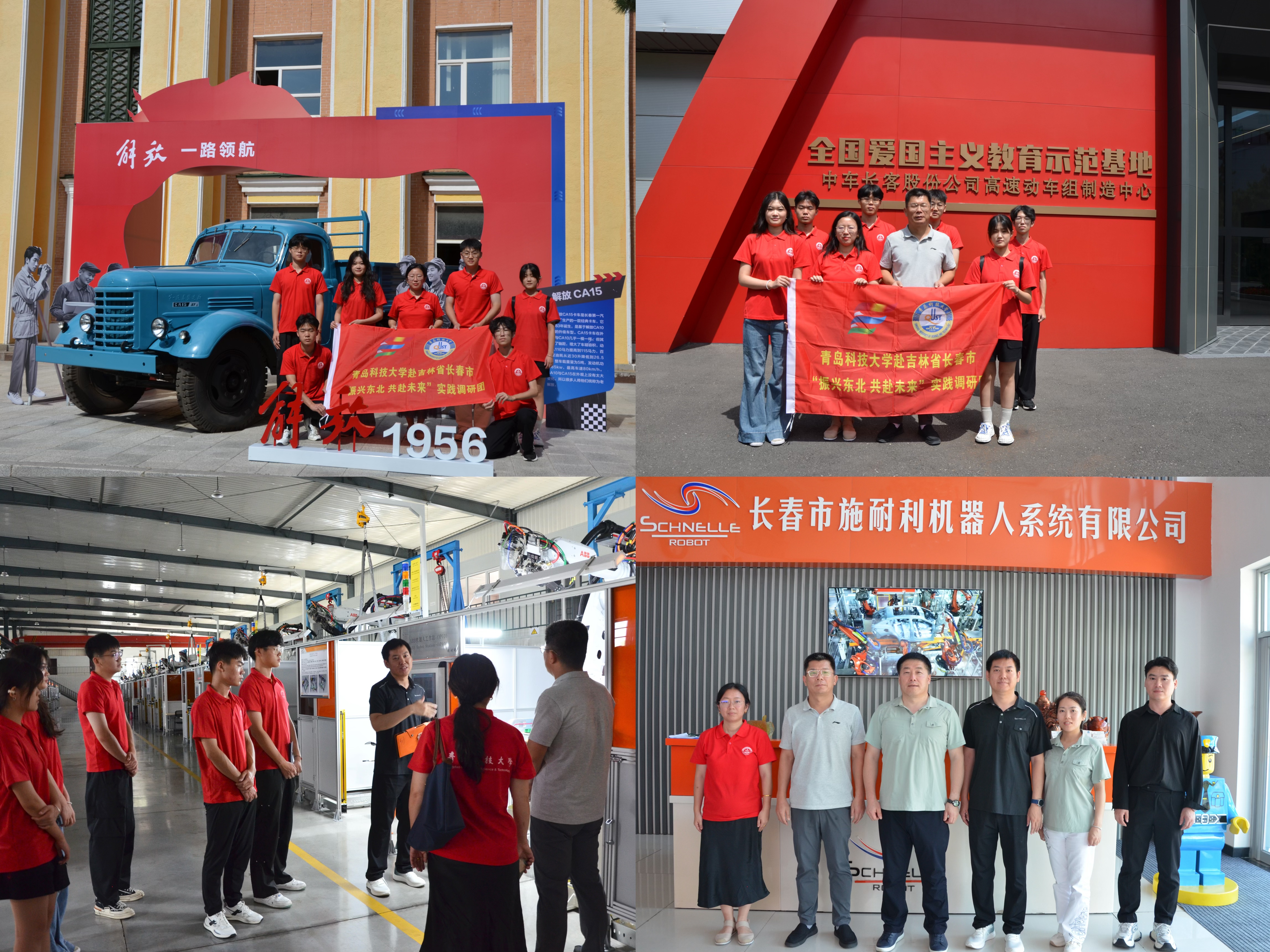 为深化专业认知、提升实践能力,同时开展访企拓岗,实践队走进中车长春轨道客车股份有限公司、中国第一汽车集团有限公司、长春施耐利机器人系统有限公司开展实践。在中车长客,队员们聆听企业发展历程讲解,观摩高速动车组装配产线,系统了解其建设规模、生产能力、研发水平及海外业绩,直观感受中国高铁制造业从“跟跑”到“领跑”的跨越式发展,深刻领悟“中国制造”向“中国智造”转型的实践内涵;于一汽集团,溯源中国汽车工业从无到有的奋斗历程,通过红旗文化展馆经典车型与技术成果展示体悟民族工业精神,观摩红旗制造中心繁荣工厂智能作业场景,感受现代化汽车制造的高效与智能;在施耐利公司,通过产学研合作座谈与生产车间观摩,了解工业机器人研发、制造及应用场景,现场学习自动化焊接、精密装配等工艺流程,深化对自动化技术的实际应用认知。