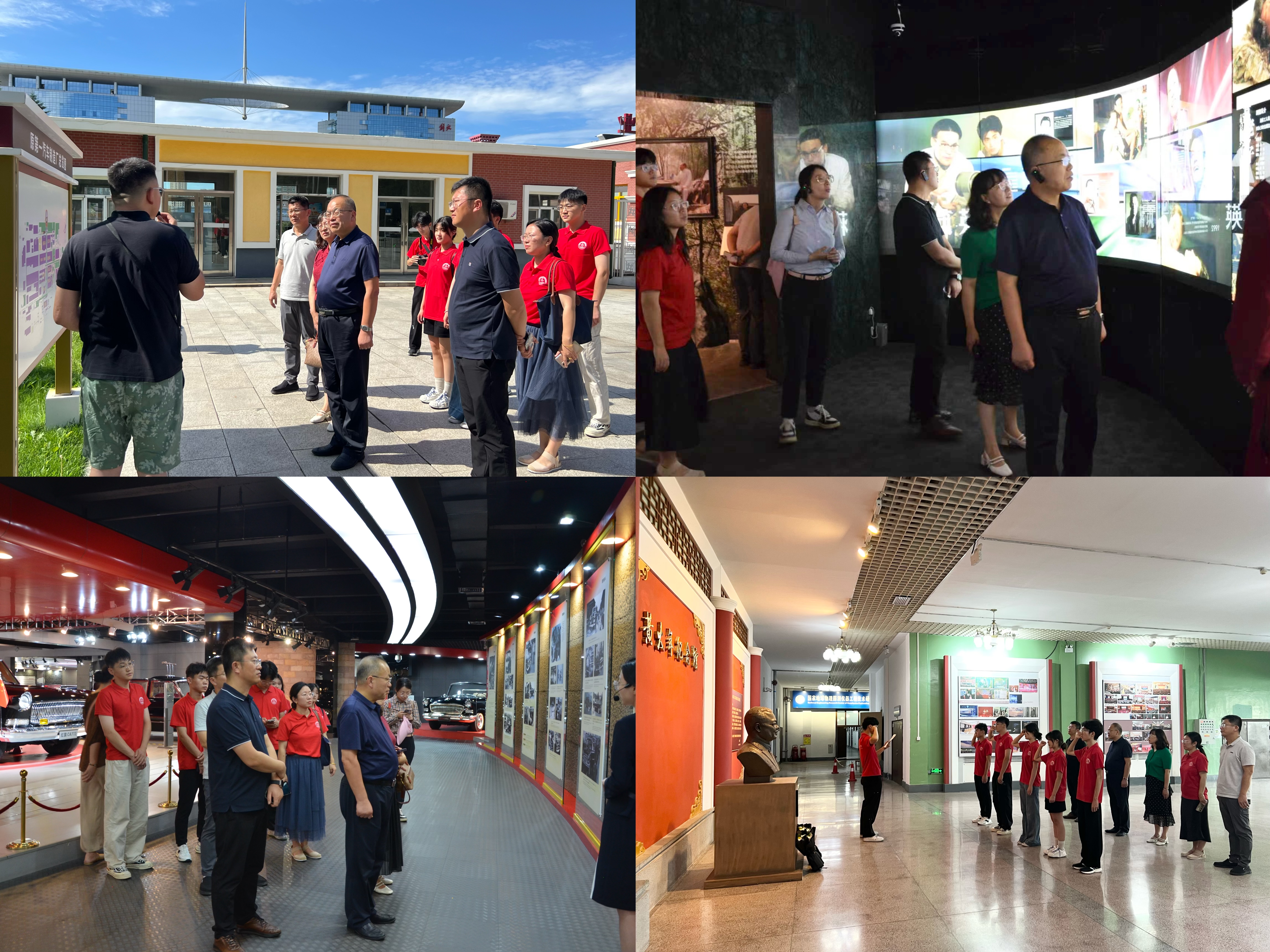 实践队将红色教育作为本次实践的核心主题,通过多维度、沉浸式的研学活动,系统接受革命历史熏陶,深刻感悟科学家与建设者的奉献精神。实践队走进黄大年纪念馆、东北沦陷史陈列馆、长春历史文化博物馆、长影旧址博物馆开展研学。黄大年教授是享誉国际的地球物理学家,他心有大我、至诚报国的感人事迹是新时代科学家精神与爱国情怀的生动诠释。在纪念馆内,实践队在讲解员的带领下,怀着崇敬的心情,认真参观了“黄大年陈列室”“黄大年办公室”“茶思屋”等主题展厅。通过珍贵的实物、详实的图片和影像资料,大家深入了解了黄大年教授毅然放弃国外优越条件回国效力、带领团队刻苦攻关取得重大突破、淡泊名利甘于奉献直至生命最后一刻的崇高人生历程,深入学习其“振兴中华,乃我辈之责”的家国情怀与科研精神。丁林代表学校向黄大年教授铜像敬献鲜花,全体成员于铜像前庄严宣誓,承诺自觉肩负科技报国使命。在东北沦陷史陈列馆,通过珍贵文物、历史影像与场景复原,系统回顾东北十四年抗战历程,强化“国家富强、民族复兴”的责任意识;在长春历史文化博物馆,队员们系统了解长春历史沿革、重大事件及英雄人物事迹,厚植红色基因;于长影旧址博物馆,通过老式摄影机、摄影棚等文物回溯中国电影事业发展脉络,感受老一辈文艺工作者的时代担当。