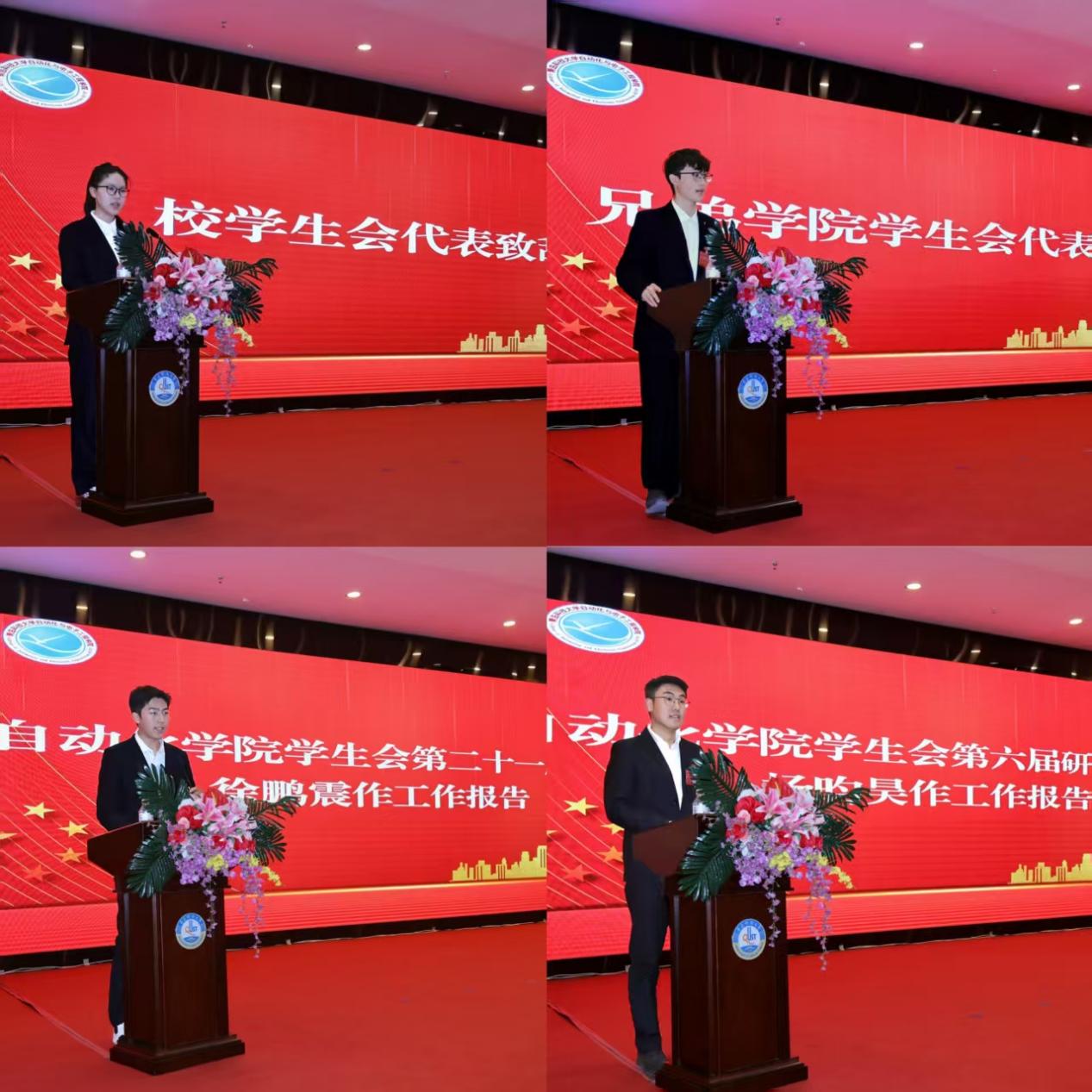 刘名森在致辞中向大会召开表示热烈祝贺,希望新一届学生会、研究生会勇挑重担、砥砺前行,以“关键少数”引领集体发展,充分发挥学生骨干模范引领作用。同时,他对在场学生代表提出两点要求:一是要在其位,谋其政,履职尽责,在安全稳定,宿舍建设,学风建设和体育锻炼中发挥积极作用;二是要争先创优,展现“自动化人”形象,勉励学院青年学生以赛促学、以赛育人,以实际行动践行“胸怀祖国、自立自强、协同创新、追求卓越”的“自动化人”精神。