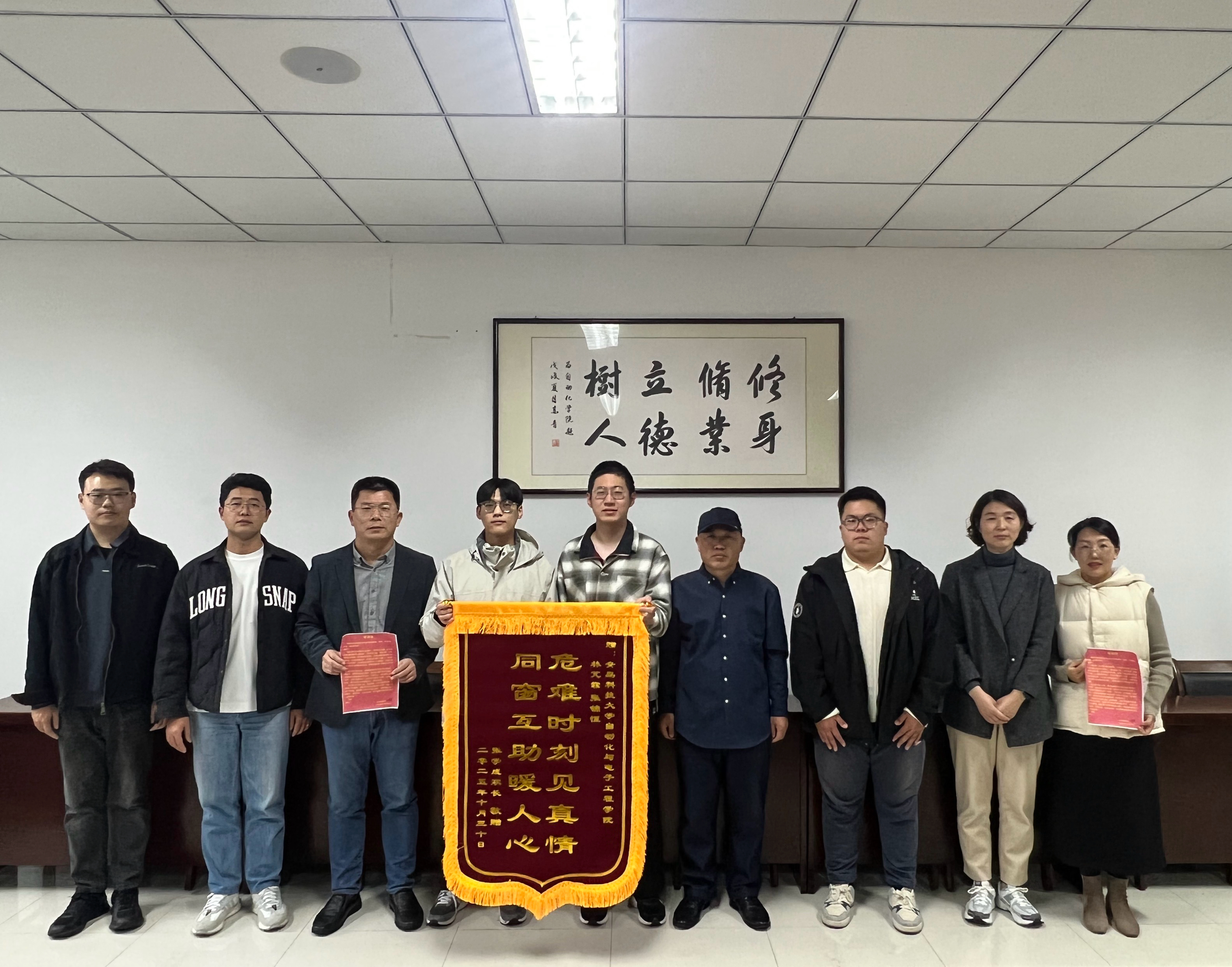 收到了一份来自广东湛江的特殊“礼物”——电气223班学生张学成的家长专程跨省而来,将一面印着“危难时刻见真情,同窗互助暖人心”的锦旗与感谢信,送到了电气223班学生张锦恒、林芃霏手中,以此感谢他们在深夜紧急救助突发急性荨麻疹的儿子,也向学院培育出有担当、有温度的青年学子表达由衷敬意。