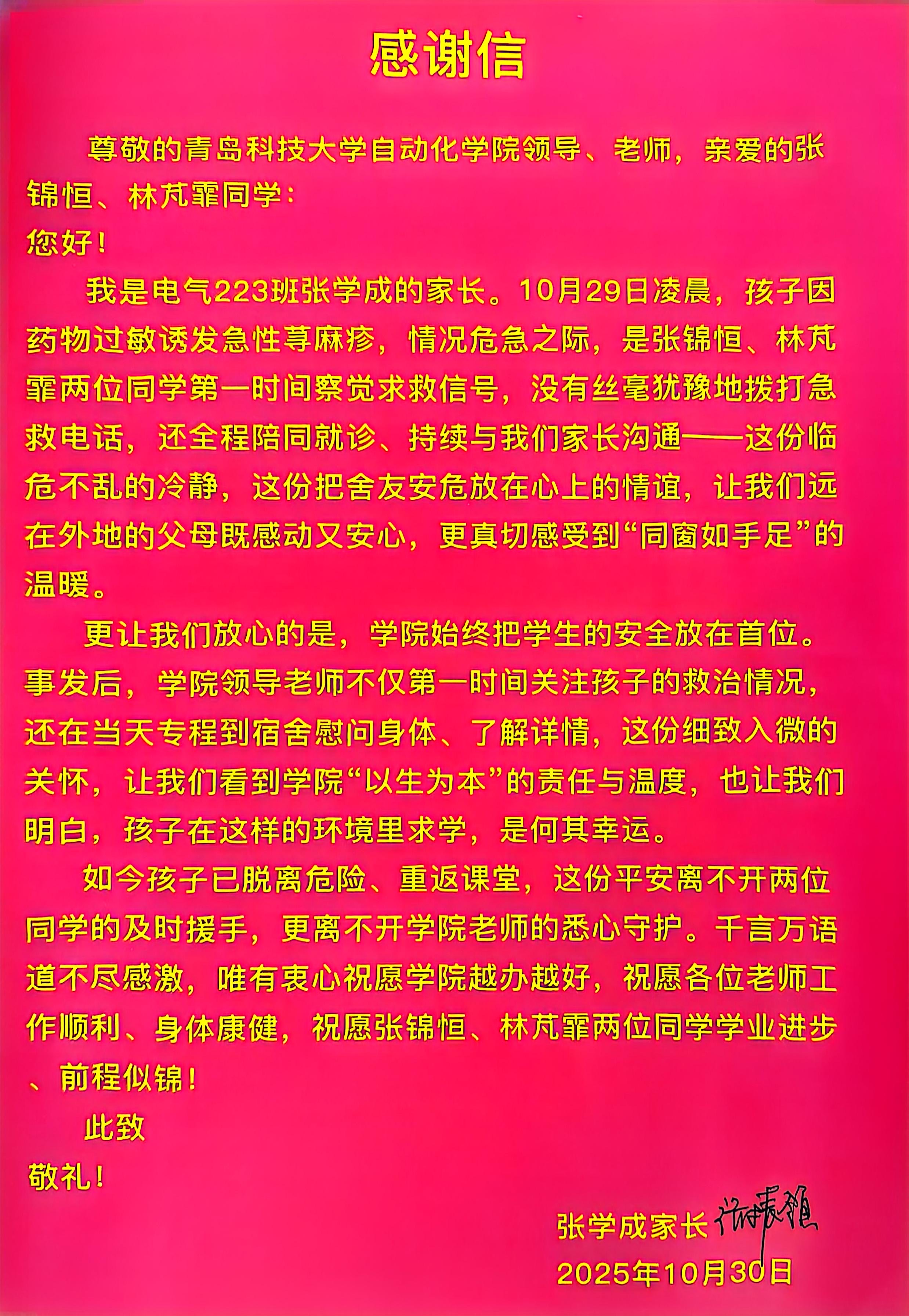 10月29日凌晨两点,张学成突发急性荨麻疹,舍友张锦恒、林芃霏察觉异常后,第一时间拨打急救电话并与辅导员和学生家长保持密切沟通。120急救车抵达宿舍楼后,医生使用肾上腺素注射液,张学成病症当下得到缓解。随后,张锦恒、林芃霏陪同医生将张学成送往齐鲁医院接受后续治疗,并于早上五点平安归校。