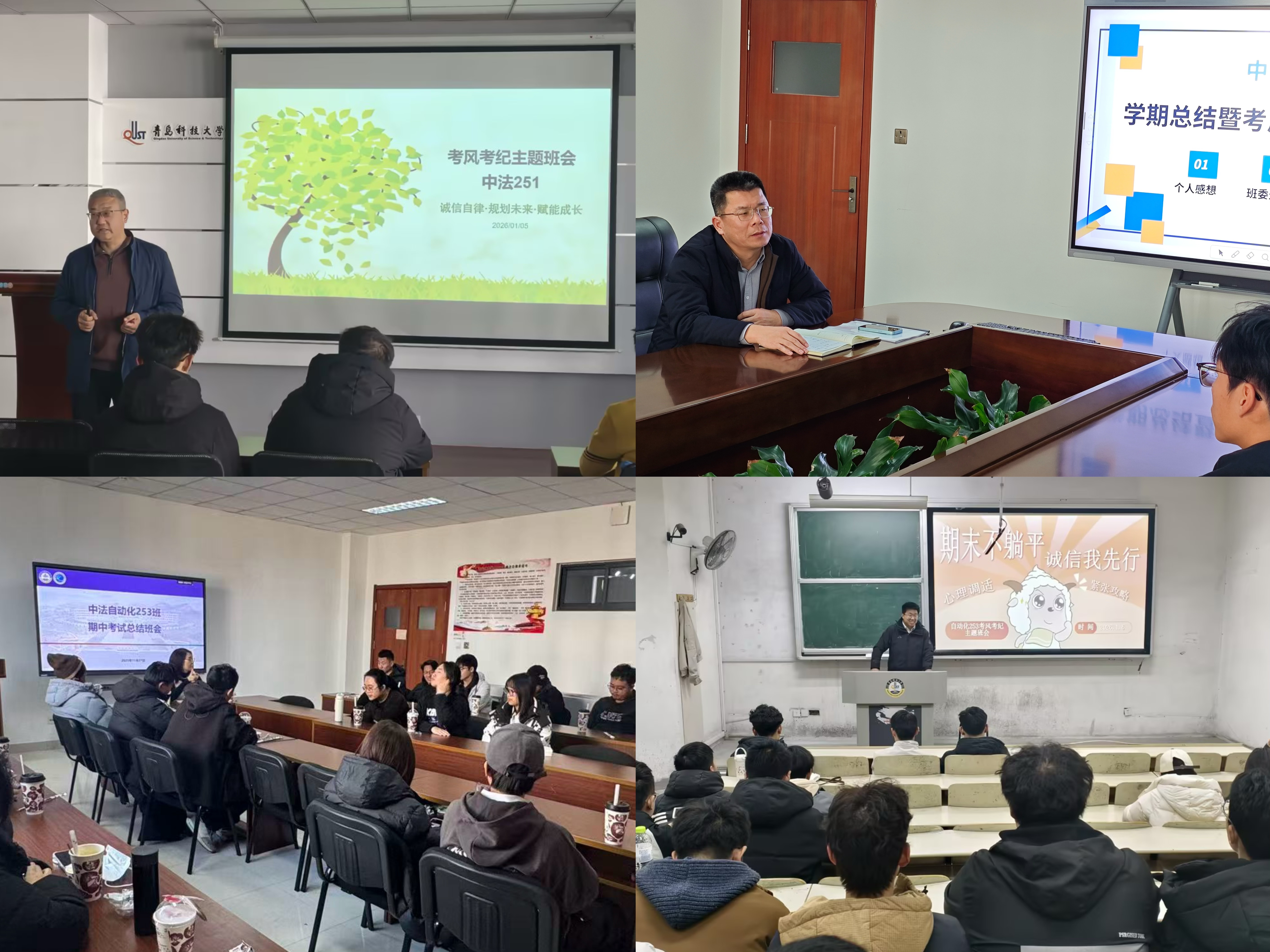 班主任、助理班主任主动担当,筑牢班级教育防线,强化与辅导员、任课教师协同联动。结合班级学情召开主题班会,严明考试规则、讲清作弊后果,引导学生树立诚信应考理念。对学习动力不足、情绪波动学生开展一对一谈心谈话,掌握思想动态,做好疏导指导,建立重点台账实施精准帮扶。助理班主任以朋辈身份分享备考经验,提升教育实效。