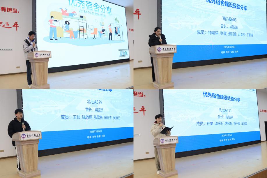 为发挥榜样引领作用,大会邀请北七B410自动化252李文强、南六B606测控242万春贤、北七A629自动化241蒋语恒、北七A411自动化233陈韬宇作为优秀宿舍代表进行经验分享。四位宿舍代表依次上台,结合日常实际,从值日分工、日常整理、细节收纳、公约制定等方面分享了宿舍卫生保持与集体管理的实用方法,充分展现了示范宿舍的良好风貌。