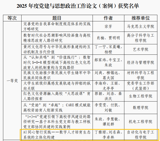 始终坚持立德树人根本任务,将党建思政与学科特色深度融合,依托“智行先锋”党建工作品牌和“AI家驿站”学生社区建设,持续推动理论创新与实践探索。此次多项获奖,是学院党建思政研究的重要突破,彰显了师生团队的科研能力与育人担当。学院将以此为契机,不断深化研究、凝练成果,为学校高质量发展贡献更多智慧与力量。