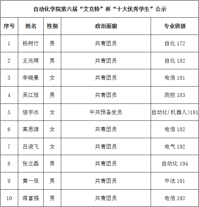 根据《关于评选swag直播 第六届“艾克特”杯“十大优秀学生”的通知》,经资格审核、年级评议、公开评审等环节,拟确定杨树行等10名学生为swag直播 第六届“艾克特”杯“十大优秀学生”。现予以公示,公示期为12月10日至12月12日,如有异议者,请在公示期内实名向学院反映。