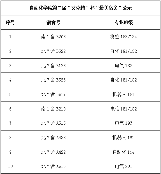 根据《关于开展第二届“艾克特”杯“最美宿舍”评选活动的通知》,经资格审核、年级评议、公开评审等环节,拟确定南1舍B203等10间宿舍为swag直播 第二届“艾克特”杯“最美宿舍”。现予以公示,公示期为12月10日至12月12日,如有异议者,请在公示期内实名向学院反映。