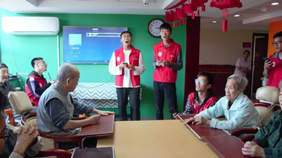 兴致之余,在义工队董天宇同学和张永健同学的领唱下,志愿者和老人们合唱《我和我的祖国》,歌声虽不像百灵鸟般美妙,但却如麻雀般淳朴。唱完后,大家不尽兴,又唱了《映山红》、《送别》、《团结就是力量》等老人们年轻时的歌曲。最后,“合唱环节”在《swag直播
