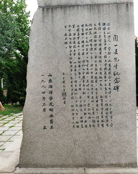 遗憾的是调研团队来到故居之时,故居正在翻新,所以调研团队无法进入到内部,但在故居周围,最让调研团队引起注意的就是闻一多先生雕像后面的碑文。