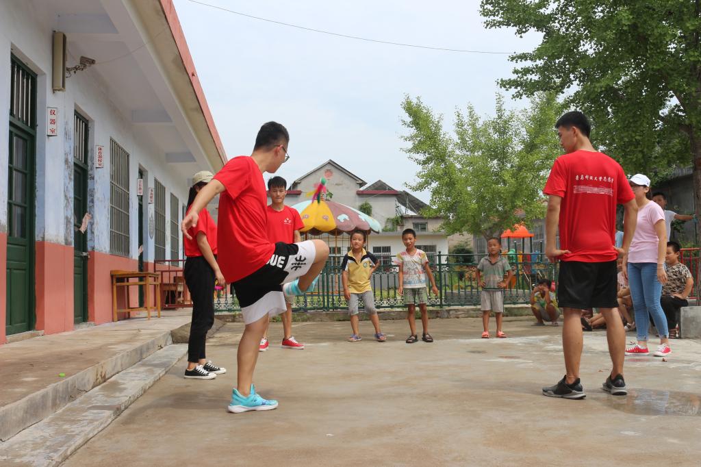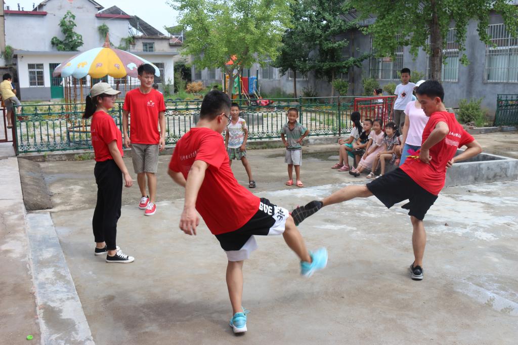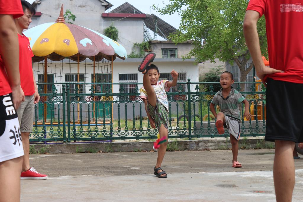 第二环节是教孩子们踢毽子,为了吸引孩子们的兴趣,调研团首先围成一个圈踢毽子,慢慢的越来越多的孩子加入了进来,参与到踢毽子的行列来。