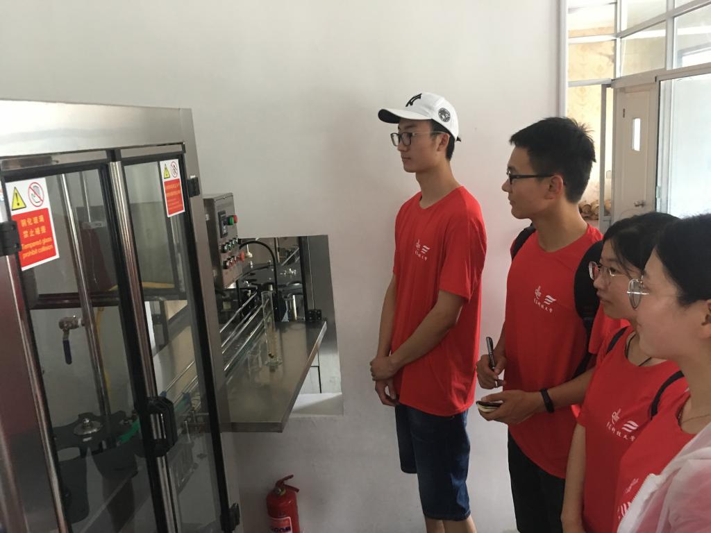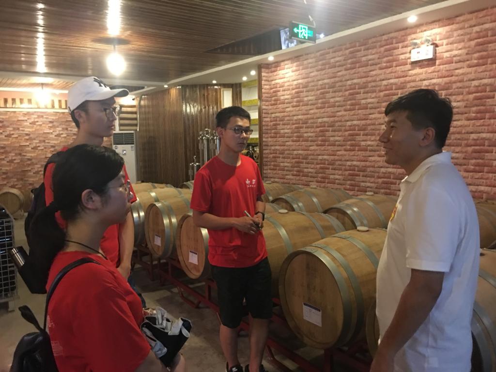 接下来,调研团参观了园内富有特色的葡萄酒酿酒车间,车间实现了从葡萄的收集发酵到封装的一体化加工,加工间、封装间、传送区划分明确,消毒处理到位。整个酿酒间只需三两工作人员操作,便捷高效,这让队员们认识到学好本专业知识的现实意义,也坚定了努力的方向。最后,调研团又参观了葡萄酒的储藏室,负责人向队员介绍了橡木桶储藏的优点和葡萄酒贮藏的条件,同学们学习到了葡萄酒的制作加工和贮藏所需要的知识。