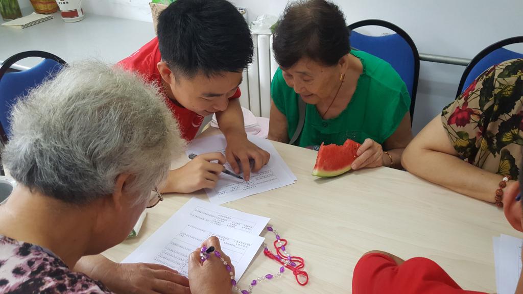 在问卷调查开始之前,实践团成员在主任纪云波的组织协调下做了老年保健操,来帮助老人们放松情绪,同时增强彼此间的了解,逐渐打开活动局面。志愿者们以口述的形式帮助老人们进行问卷填写,并由问卷问题延伸至老人的情感诉说,老人们也十分愿意跟志愿青年们进行交流。经过初步的调查,老人们在物质生活方面比较满足,以退休金为主要经济来源,他们大多欠缺的是精神情感上的心理需求。他们表示每天最快乐的时光就是在老年人日间照料中心跟老师学习按摩、保健等课程以及与其他老人一起唱歌跳舞做针线活等活动。