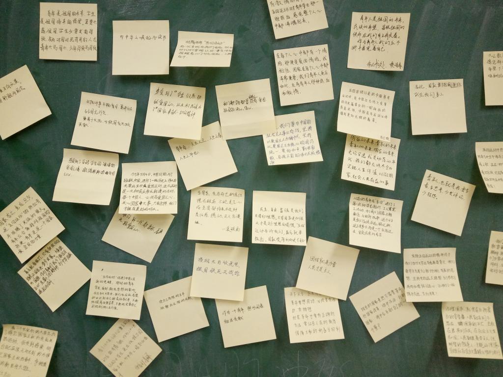 下午7:00活动准时开始,孙晗松首先带领同学们观看了有关五四爱国运动的影片。影片还原了当时具有先进思想的学生、老师、社会人士游说演讲、传播巴黎会议情报的情形。怀有爱国热情的学生们写字状,喊口号集体上街游行,抗议卖国辱权的条约,捍卫中国主权与领土完整。趁着大家的情感还沉浸在坚定不移维护国家的权与法之中,主持人紧接着播放了讲论法制与法治、人治与法治的内涵、区别与发展的讲坛片段,同学们意识到了当今社会主义民主制度的优势和完善来之不易。影片结束之后,大家纷纷动笔在纸条上抒写心得体会,最后将纸条贴在黑板上互相分享并交流自己的爱国格言。