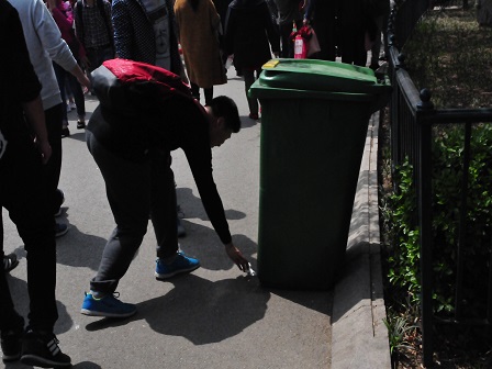 活动正式拉开序幕,班长和团支书事先强调好注意事项后就朝着中山公园出发;值此中山公园樱花盛开,景色秀丽,同学们在欣赏美景的同时不忘随手捡起地上的垃圾。活动后期,同学们分成四队,对随手丢弃垃圾的路人进行劝阻,宣传环保理念,游客们对我们的活动表示了充分的支持与肯定,有些游客还对我们的活动提了一些建议。从中山公园出来后,同学们又一起去了第二海水浴场,在沙滩上交流活动心得,又一起做游戏,最后同学们拍照留念。