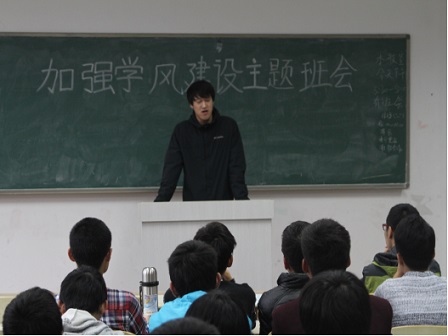 在班长丁恒做了关于加强学风建设重要性的发言之后, 班会正式开始。在班会上,徐甲田结合切身的体会和心得,对同学们提出了五点建议:一是把学业摆在最重要的位置,谨记学生的首要任务是学习,严格要求自己,尽快适应从中学生到大学生的角色转变;二是提高人际交往能力,以全面发展为目标;三是友爱同学,增强班级的向心力,争取心往一处想,劲往一处使;四是加强自律,增强自制力,争创文明课堂,拒做“低头族”;五是提高个人素质,提升思想道德修养,争做四有公民。