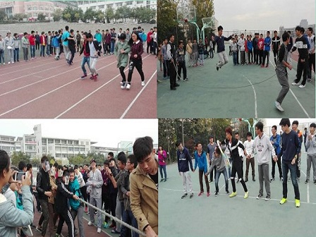 本届运动会项目充分彰显了当今大学生昂扬向上、奋勇直前的优秀精神风貌,并且比赛项目趣味性十足,竞技性强,涉及了“呼啦圈传递”、“跳大绳”“两人三足”、“拔河”四个重点比赛项目。其中的二人三足比赛,在热烈的加油与呐喊声中,各队运动员精神饱满、信心高涨,互相搀扶着奔向终点,考验着同学们的团队协调与合作能力。选手们纷纷以饱满的热情全身心的投入到比赛中,虽在赛场上你争我赶,不相落后;然而,赛后却展现了不为人知的一面:“敌人”之间竟相互搀扶,夸奖对方的强势。