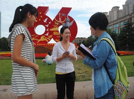 活动伊始,记者走访了五四广场,对路人就爱国主义的理解和如何将爱国付诸行动进行采访。多数人说到,爱国主义就是“不忘国耻,铭记历史”、“坚决维护祖国利益”,针对于爱国行动,人们表示从“最起码要尊重国旗国歌”、“保护好周围环境卫生”等诸多身边事入手。当记者问及看完9月3日大阅兵后有何感想时,路人纷纷热烈回应“充满自豪感”、“感觉到中国的一天天强大”、“非常壮观”等。记者让受访者为祖国献上一首红歌,来共同庆祝中华人民共和国成立六十六周年,路人积极配合,《十送红军》、《我的祖国》等红歌被再度唱响。