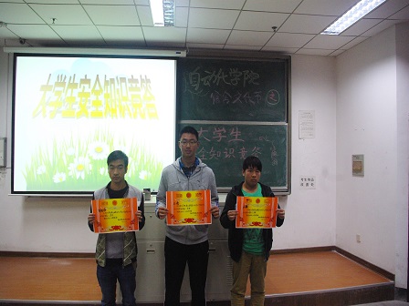 竞赛分为两轮,分别是“步步为营”和“晋级抢答”。首先进行的是“步步为营”,共有20道题,参赛者平均分为7个小组,先后进行答题,每组有5分钟的时间。比赛过程中同学们认真地回答,同时为上场的同学也积极地准备着,整个赛场气氛十分活跃,经过长达约30分钟的角逐,8位同学进入了第二轮“晋级抢答”,这也是最精彩的一部分。赛题为20道单选题,它们涉及到“火灾应变措施”、“各种灭火器用途”、“财产失窃处理方案”等多个安全知识方面。主持人话音刚落,参赛同学就竞相举起手,精彩的回答引来观众的一阵阵掌声,无论对错,大家都很开心,教室里充满欢呼声。在激烈的竞争后,三名胜利者脱颖而出,他们分别是第一名1#B518电网141班的王浩,第二名5#B618测控144班的郭延非,第三名5#B615测控143班的王皝。最后,在观众的掌声中,三名获胜者合影留念。
