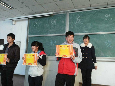 下午四点,班会准时开始。首先由班长薛祎对班级从开学到现在所取得的成绩进行了总结,鼓励了辩论赛、足球队、演讲比赛、象棋比赛、户外文化节、宿舍文化节等活动的参赛人员。然后由副班长总结期中考试的情况,并号召大家为即将到来的期末考试做好充分的准备。接下来团支书为在期中考试中取得优异成绩的同学颁发奖状,台下响起了热烈的掌声。班会有条不紊的进行着,学习委员就大家最关心的学分和挂科问题进行了补充说明,提醒大家不要把及格作为目标,使大家认识到大学学习也绝不能懈怠。为宣传学校即将举行的“五个文明”活动,宣传委员鼓励大家积极参加,并与大家一起讨论了活动方案。然后生活委员提醒大家注意宿舍安全和宿舍卫生,并且要做好冬季保暖。最后,班长总结了班会的内容,在热烈的掌声中班会结束。