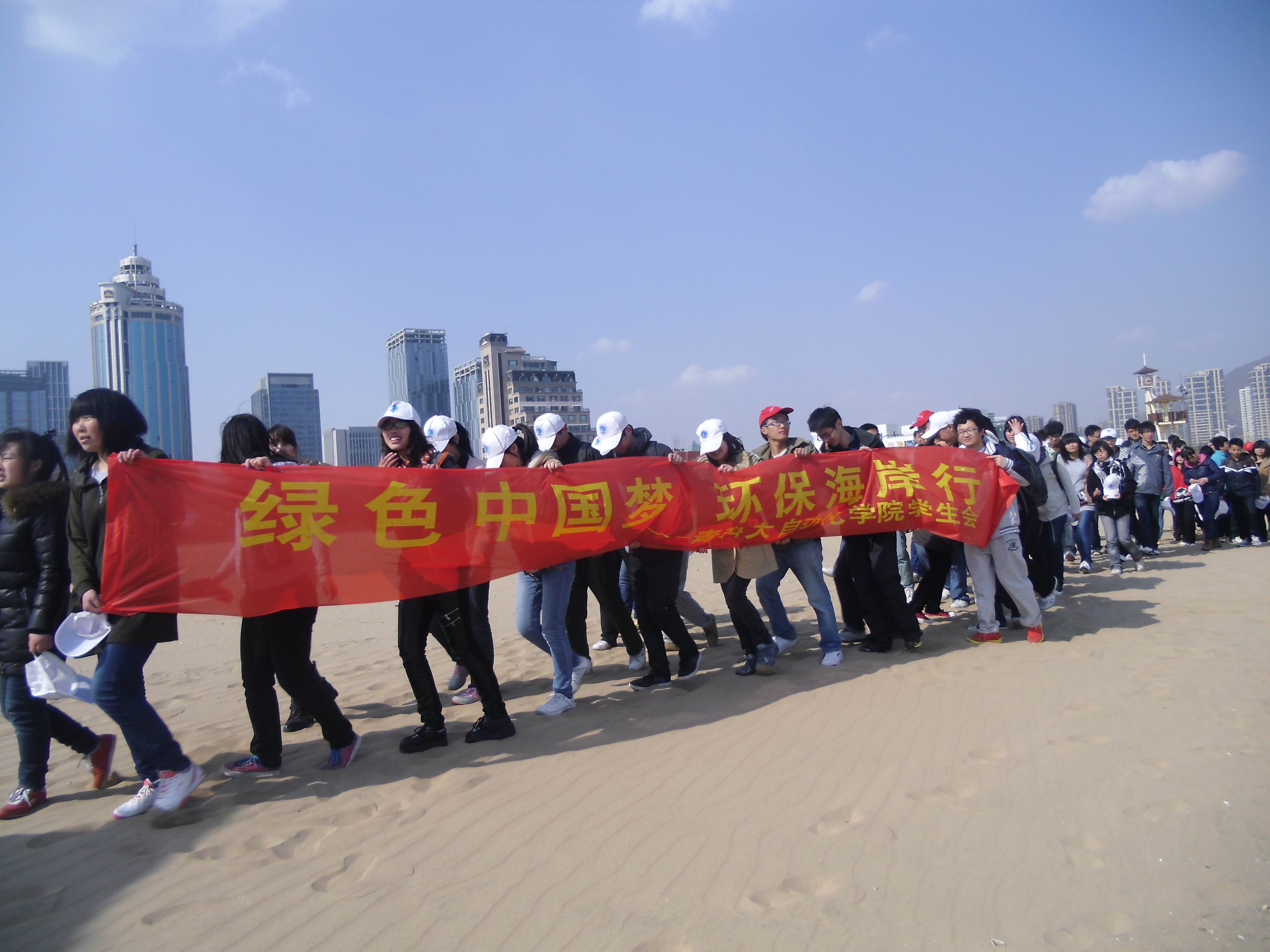 学生会和青年志愿者协会的近百名环保志愿者在石老人海水浴场开展了以“绿色中国梦 环保海岸行”为主题的环保志愿公益活动。活动中,志愿者们首先给市民及游客们宣传生态文明观念和环境保护知识,并举行了现场签名活动。随后,志愿者们以徒步行走的方式,沿海岸线清理垃圾,用自己的实际行动来感召广大市民和游客对环境保护的重视。