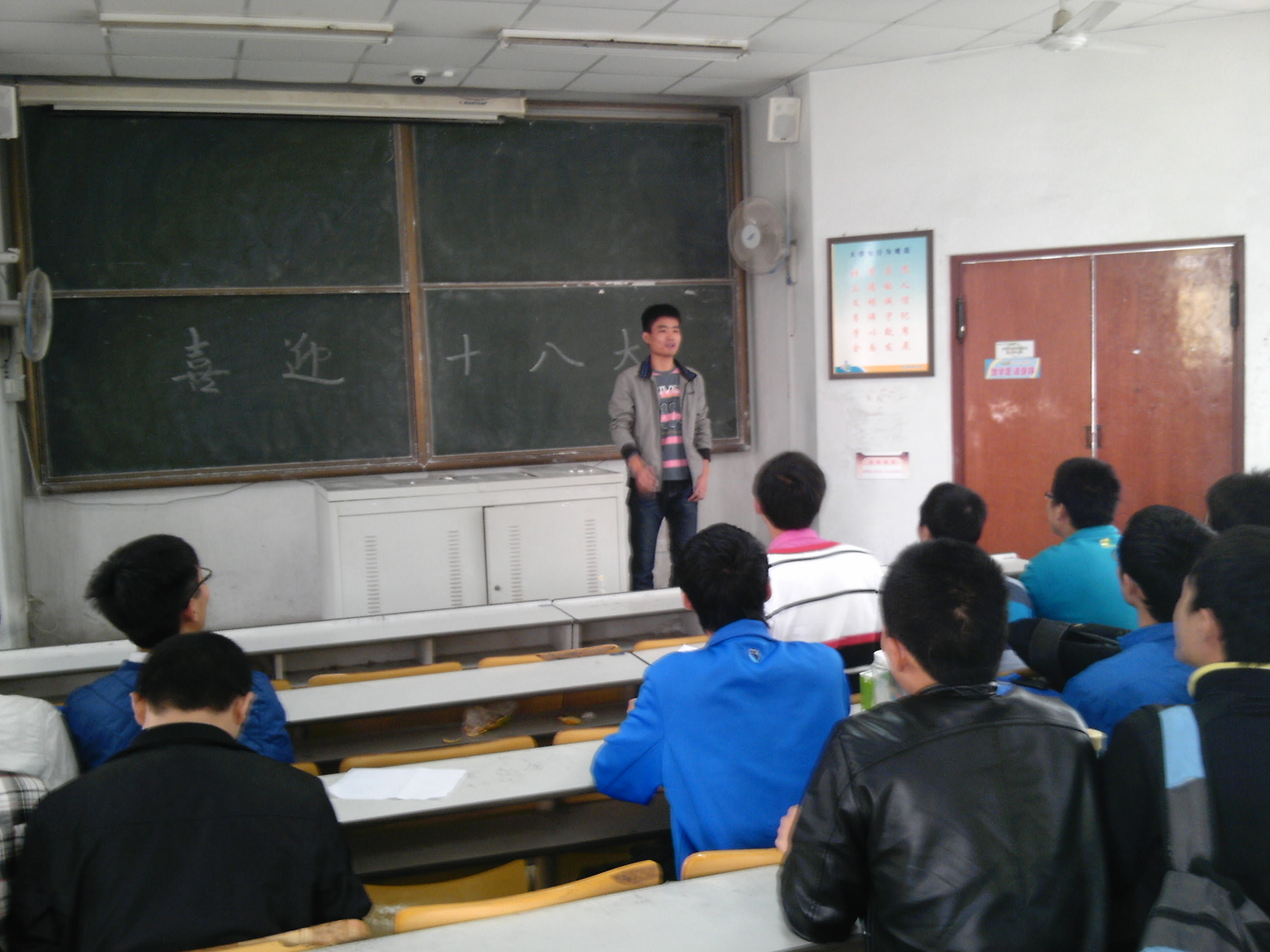 全班30名同学尽数参与。班会由班长,团支书共同主持。班长对十八大进行了总体介绍,加深了大家对这一重要会议的了解。两人分别对十八大的具体内容进行了全面解释,让大家觉得十八大就在我们身边。根据班会的主题,班级还举行了“喜迎十八大”书法大赛。采用计时书法的形式,由在场同学在五分钟内写下必选内容(喜迎十八大,共享新生活,预祝党的十八大胜利召开)和选写内容(自己最想对党和祖国说的话)。之后大家通过投票选出优秀的作品,由班长为他们颁发精美的小礼品。