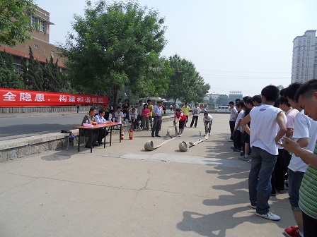 分团委副书记刘兆鹏老师主持,校消防科黄强科长对同学进行消防演练指导,2010级学生参与此次演练活动。活动分为两部分,一是教同学如何正确使用灭火器。二是教同学们如何正确使用消防水带。老师认真指导,同学们积极主动参与,促使演练活动顺利进行。活动最后,同学们在“消除安全隐患,构建和谐校园”横幅上进行大签名活动。