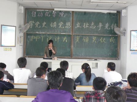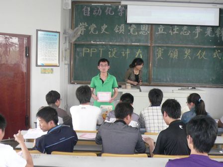 本次PPT设计大赛,共收到各学院几十份作品,以“庆祝建党90周年 重温党史历程”为总主题,参赛者将自己对党史的感受与理解融入到自己的PPT创作中,以PPT的形式的展示出自己对党艰难发展历程的感想。由于评委时间所限,本次比赛的评奖在昨天已结束,比赛共评出了1个一等奖,3个二等奖,6个三等奖以及优秀奖若干。2:00主持人宣布仪式正式开始,公布获奖者名单,学生会各部副部为各位获奖选手颁发奖品及证书,并在最后为到场的选手及观众放映了一等奖获得者倪源同学的作品。倪源同学的作品中包含了自己制作的视频、图片等,这些元素展现出了选手们丰富的想象力和创造力,他的作品表达出对共产党的艰难历程进行了深刻的探索和敬重之情。