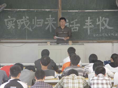 分团委副书记刘名森和赴新泰实践团成员,大二同学和新生班干部参加了交流大会,大会由赴新泰实践团团长史新研主持。