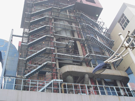 良达公司的郭经理把实践团带到了真正的锅炉生产车间时,大家大吃一惊,屹立在面前的已经不是同学们所能想象到的大,三个足有三十几米大的巨型复杂铁架把视线直接带到白云相接的地方。郭经理首先是给大家介绍了锅炉生产在整个发电生产系统中所占的重要地位,然后强调了锅炉系统的工作原理、维护和保养,重点给同学们强调的是现代锅炉生产设备的智能型、自动化以及它的环保性。大家很容易看到伫立在巨型锅炉旁边的是一座差不多大的净化环保循环系统,这让人不禁赞叹中国的环保型经济增长模式对于整个地球环保事业的巨大贡献。