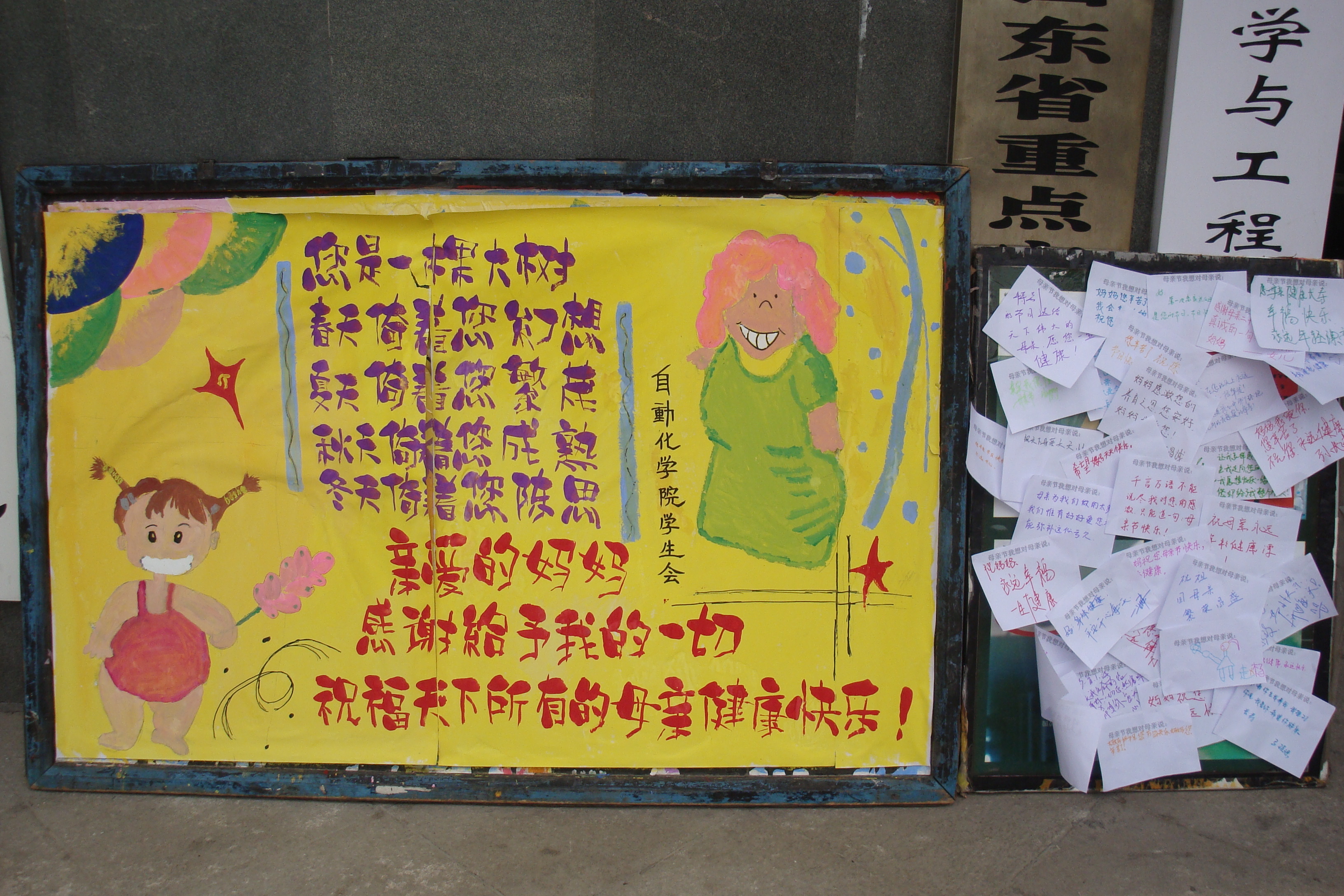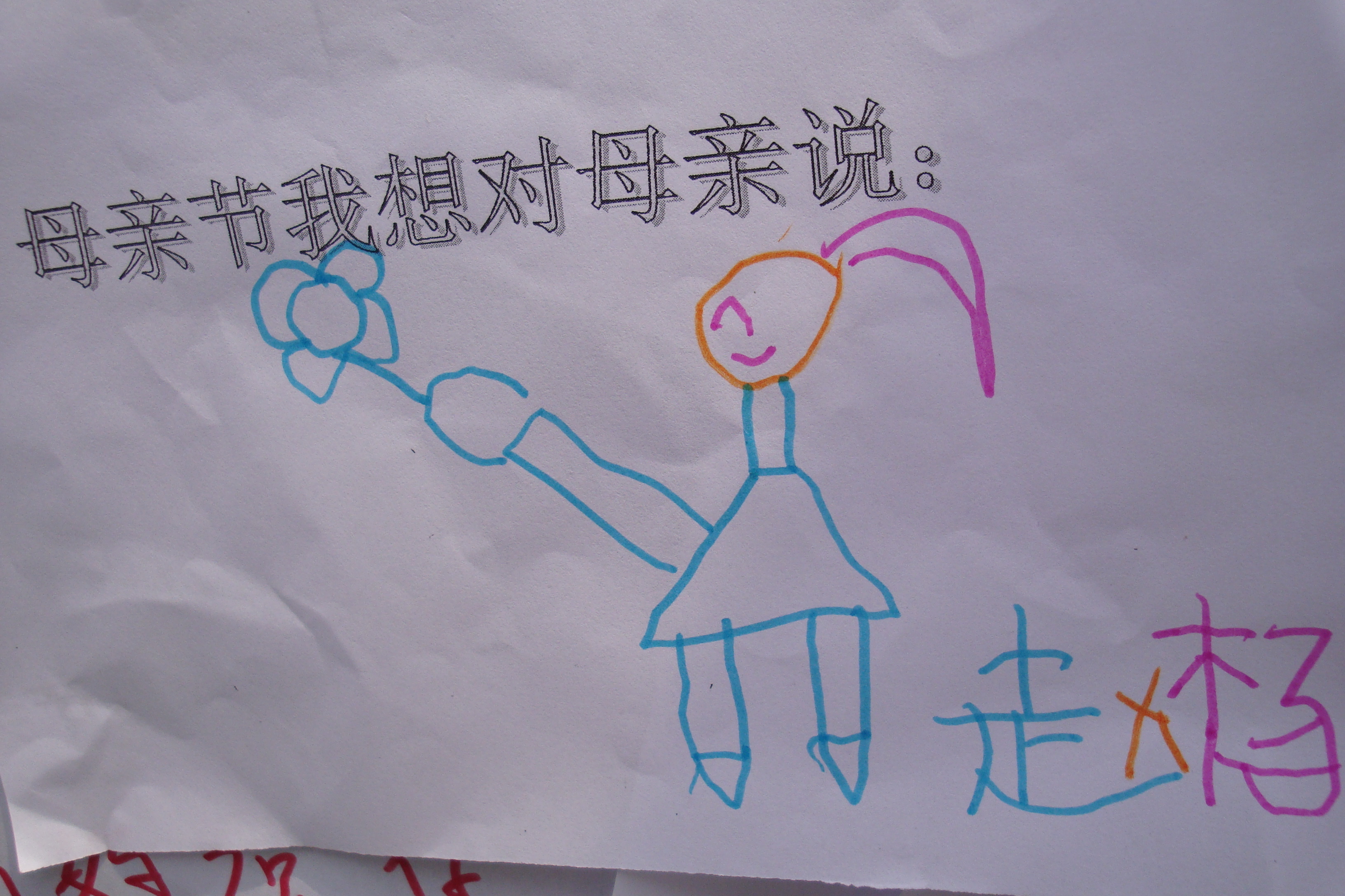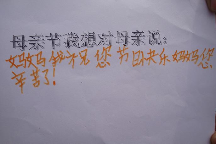 我们提供了展板和宣传纸,要求孩子们写下他们对母亲的祝福,相对母亲说的话。那些幼稚的字并不漂亮,还有些歪斜,可那却是他们发自内心对妈妈的祝福。“妈妈辛苦了”“妈妈永远年轻漂亮”“妈妈我爱你”“妈妈我要永远和你在一起”一字字,一句句,涌动在每个人的心里,是幸福、感动,还是别的什么?