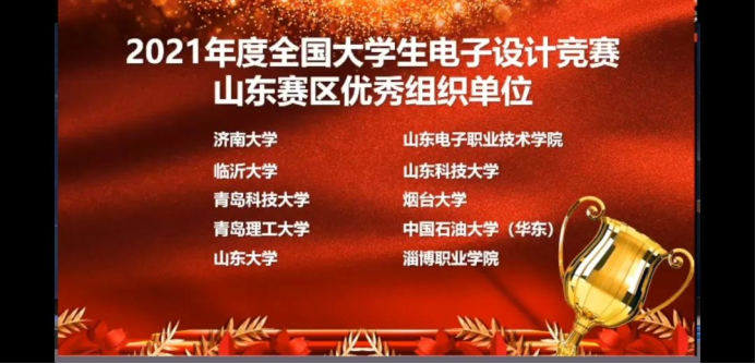 在2021年全国大学生电子设计竞赛中被评为山东赛区优秀组织单位,位列10所获奖单位的第三位,继2017、2020年被评为优秀组织单位后,再次获得此荣誉。