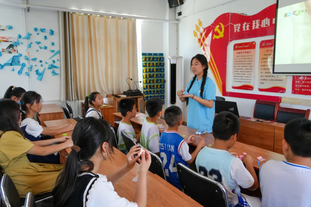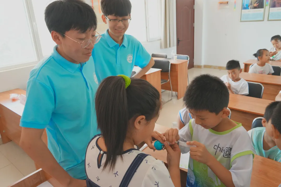 学子组成的队伍,他们结合自身专业打造了独特创新的实验课堂,让科创课成为了此次支教活动的亮点之一。为了给孩子们带来生动有趣的物理小实验,他们一早准备好实验道具,借助马德堡半球实验,让孩子们真正感受到大气压强的神奇力量。同时为提高孩子们的参与感与动手能力,志愿者带领他们亲自动手操作,让孩子们在实践中感受物理实验的魅力。这堂科创课不仅激发了孩子们的科学兴趣,还让他们相信自己未来定能够用自己的智慧点亮科学的星空。