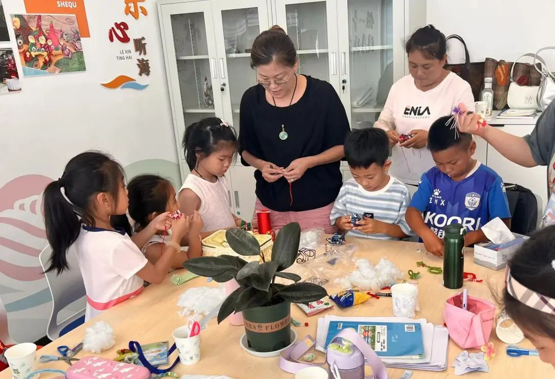 社区的老师和志愿者们一起带领孩子们动手制作属于自己的驱蚊香囊。志愿者们化身孩子们的“得力小帮手”,在旁边帮助他们塞棉花和香料、裁剪红绳、串接流苏等,现场气氛热烈,大家相互交流、分享心得,欢声笑语不断。