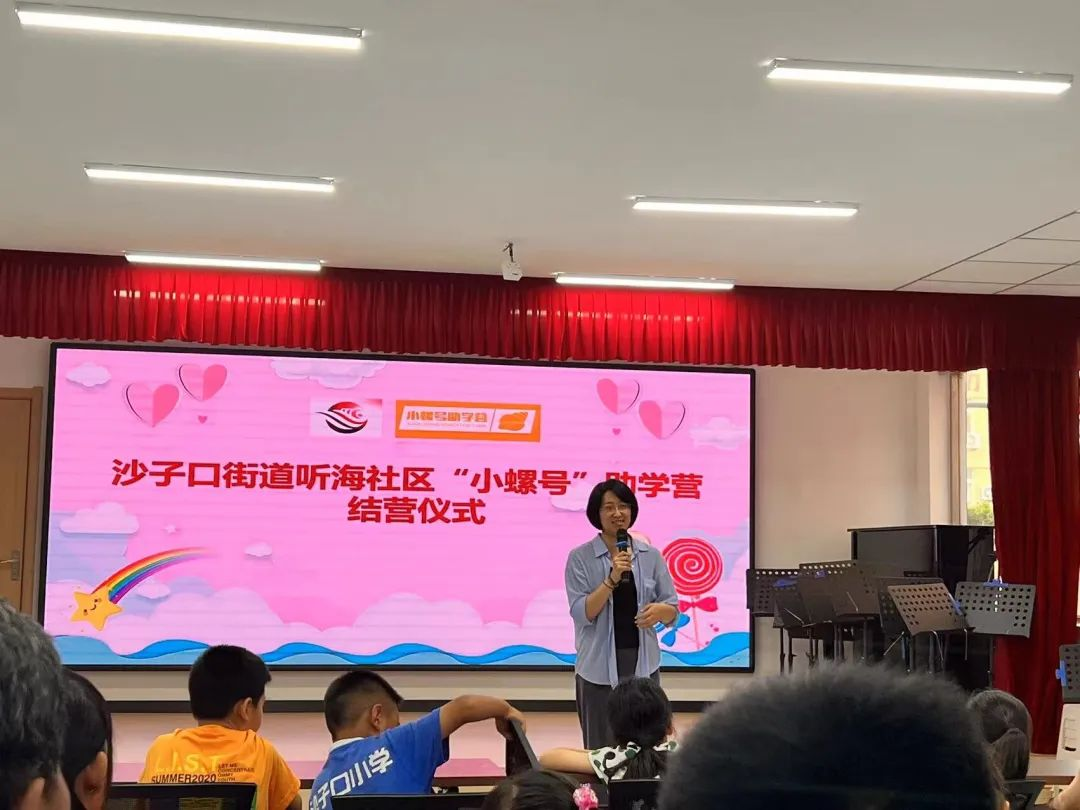仪式伊始,听海社区党支部副书记蒙佳发言,针对两个周的助学营生活进行了总结,表扬了孩子们在这两个周内的优秀表现,询问了个别同学的学习情况和感想,她指出孩子的教育不是一朝一夕的事情,家长们需要提升自己的认知和看法,这样才能更好引领孩子。最后,她对实践团所有成员及学校和相关负责老师表达真挚的感谢。