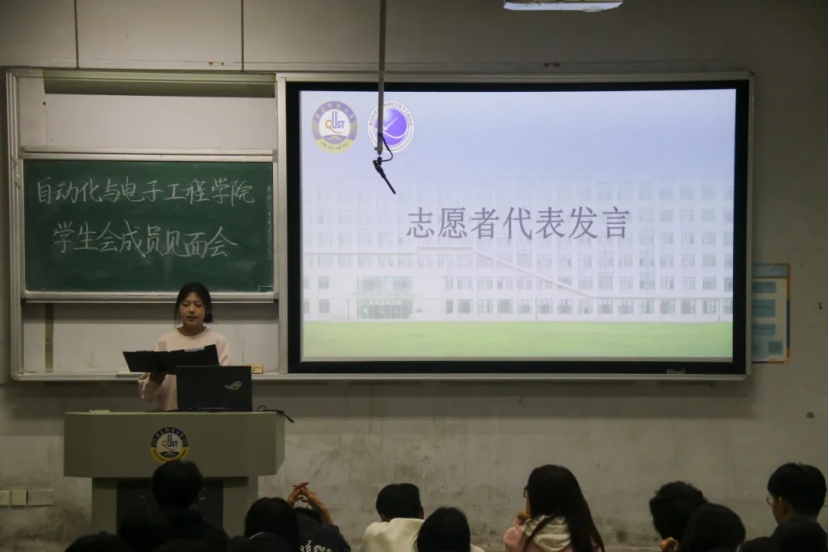 张润涵作为新生志愿者代表上台发言,她首先表达了成为学生会一份子的激动欣喜,并表示将积极响应学院号召,认真履行志愿者职责,积极参与到学生会各项活动中去。