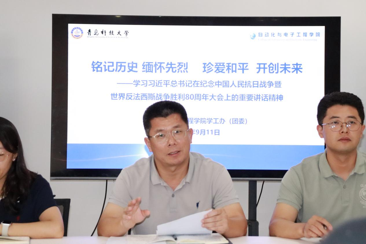 于崂山校区“一站式”学生社区组织学团骨干举办中国人民抗日战争暨世界反法西斯战争胜利80周年主题纪念活动。学院党委副书记兼副院长刘名森,辅导员张郁浩、徐文丽、马仁轩、李卓林、丁雅琼、董一凡及学团骨干40余人参加活动。活动由23级辅导员刘志飞主持。