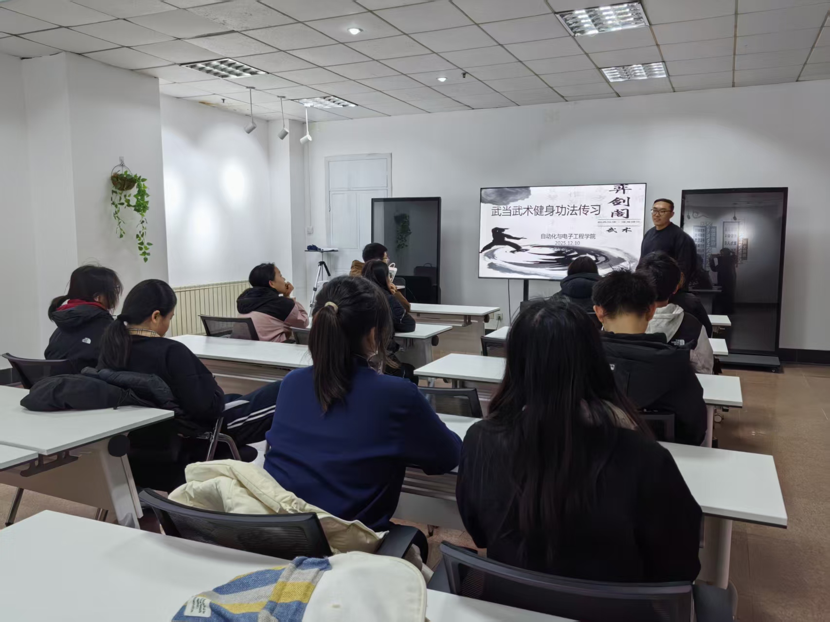 在学校“一站式”学生社区举办“武当武术健身功法传习讲座”。讲座由学院辅导员李卓林主持,特邀学校弈剑阁武术协会负责人担任主讲,吸引了众多学生踊跃参与。